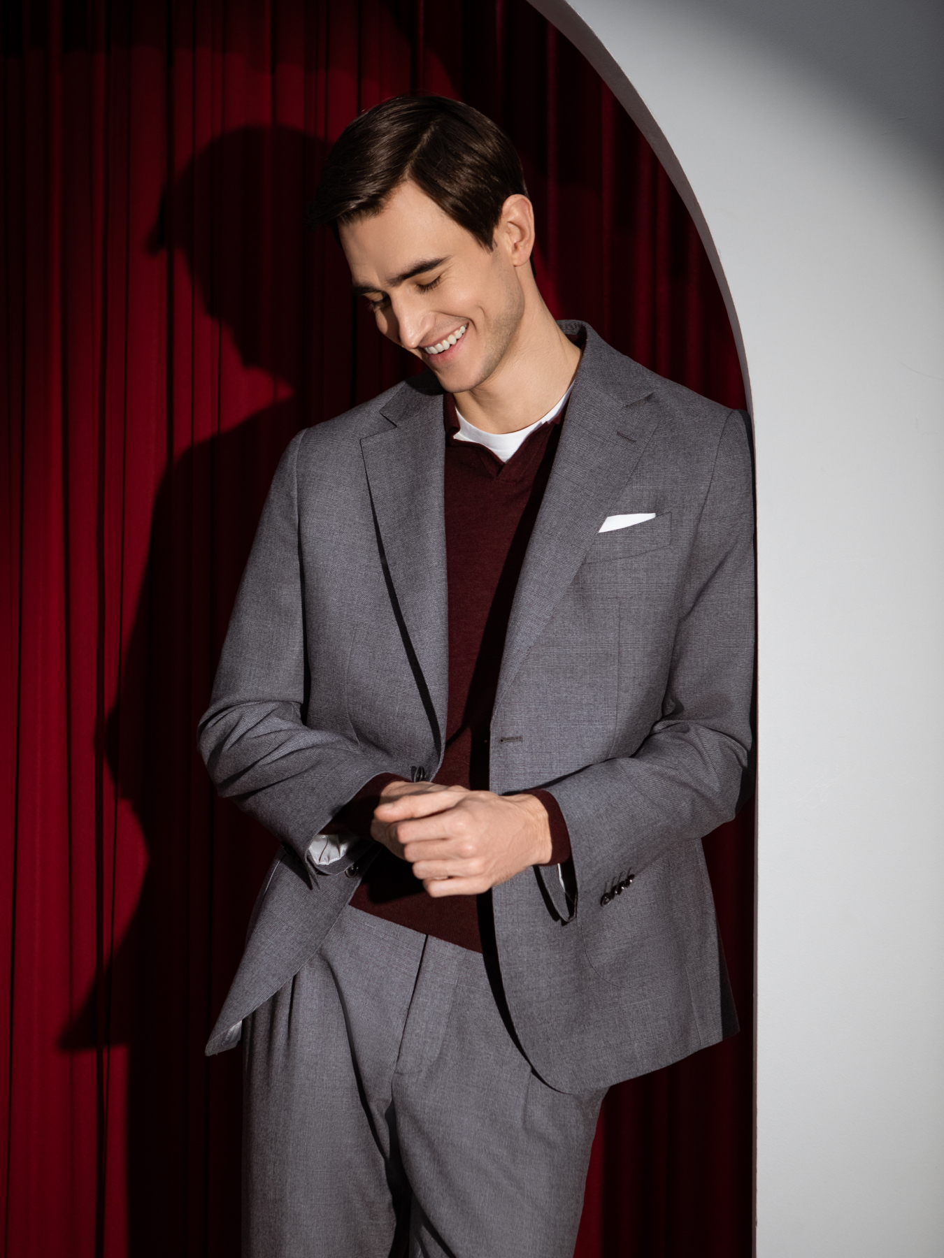Идеальным выбором станет тёмно-синий, графитовый или черный пиджак из кашемира.