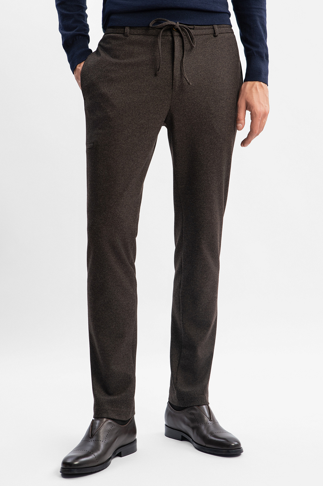 Серо-коричневые брюки KANZLER с кулиской из мягкой смесовой шерстяной ткани в мелкий рубчик — удобная повседневная модель, основа для создания образов в офисном и городском стилях. Приталенный силуэт вытягивает и стройнит фигуру. Шнурок-затяжка позволяет регулировать степень прилегания брюк. Приятная воздухопроницаемая ткань из шерсти поддерживает оптимальную для тела температуру. Для практичности, износоустойчивости и сохранения формы материал усилен волокнами вискозы, полиэстера и эластана. Подкладка из прочной гладкой ткани облегчает надевание. Параметры модели: рост 192, 101-76-97 Размер на модели: 50
