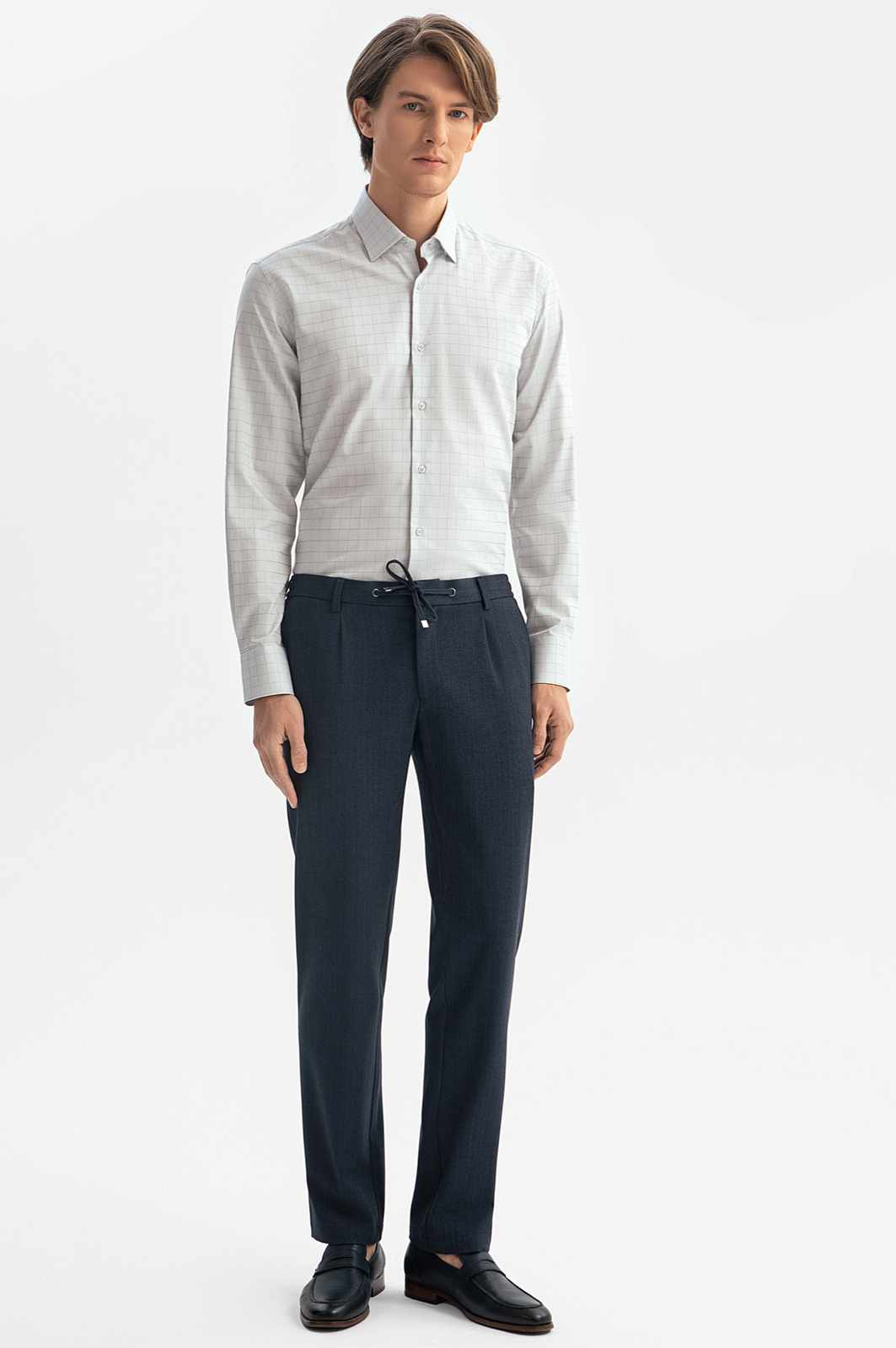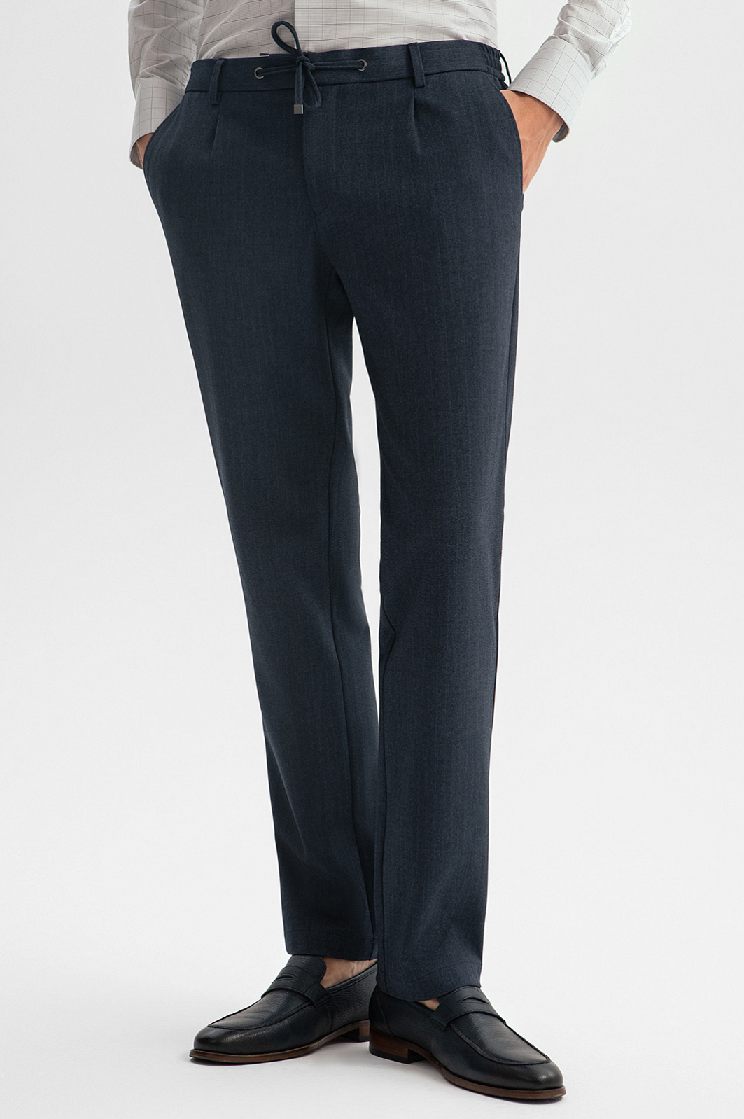 Брюки KANZLER на кулиске сдержанного серо-синего оттенка — представляют собой не слишком формальный, но при этом современный и элегантный вариант одежды для офиса и свободного времени. Приталенный крой добавляет образу легкости и изысканности. Кулиска позволяет регулировать степень прилегания брюк. Износоустойчивая смесовая ткань с переплетением «елочка» состоит из трех видов современных волокон и отличается прочностью, практичностью в уходе и эластичностью. Материал хорошо держит форму, не мнется и адаптируется к индивидуальным особенностям фигуры. Параметры модели: рост 191, 97-77-99 Размер на модели: 50