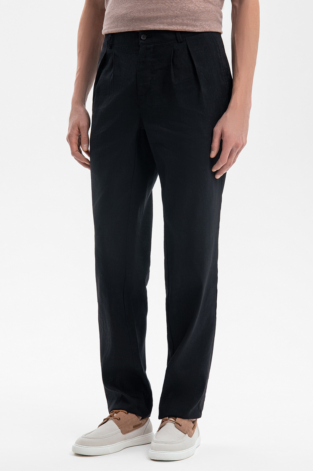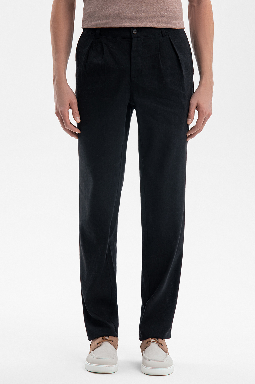 Для создания черных брюк KANZLER из лимитированной коллекции выбрали премиальную ткань от итальянской мануфактуры Lanificio TG di Fabio. Материал плотного плетения с благородной матовой фактурой объединил лучшие свойства волокон льна и шерсти. Лен обеспечивает воздухопроницаемость и идеальную терморегуляцию, а упругие волокна шерсти дарят мягкость и поддерживают форму. Небольшое добавление эластана служит для идеальной посадки и прочности. Классический крой переосмыслен для современного мужчины. Защипы на талии привносят нотку расслабленности в лаконичный силуэт. Это универсальный элемент гардероба, уместный и в деловой, и в неформальной обстановке. Параметры модели: рост 189, 91-78-95 Размер на модели: 50