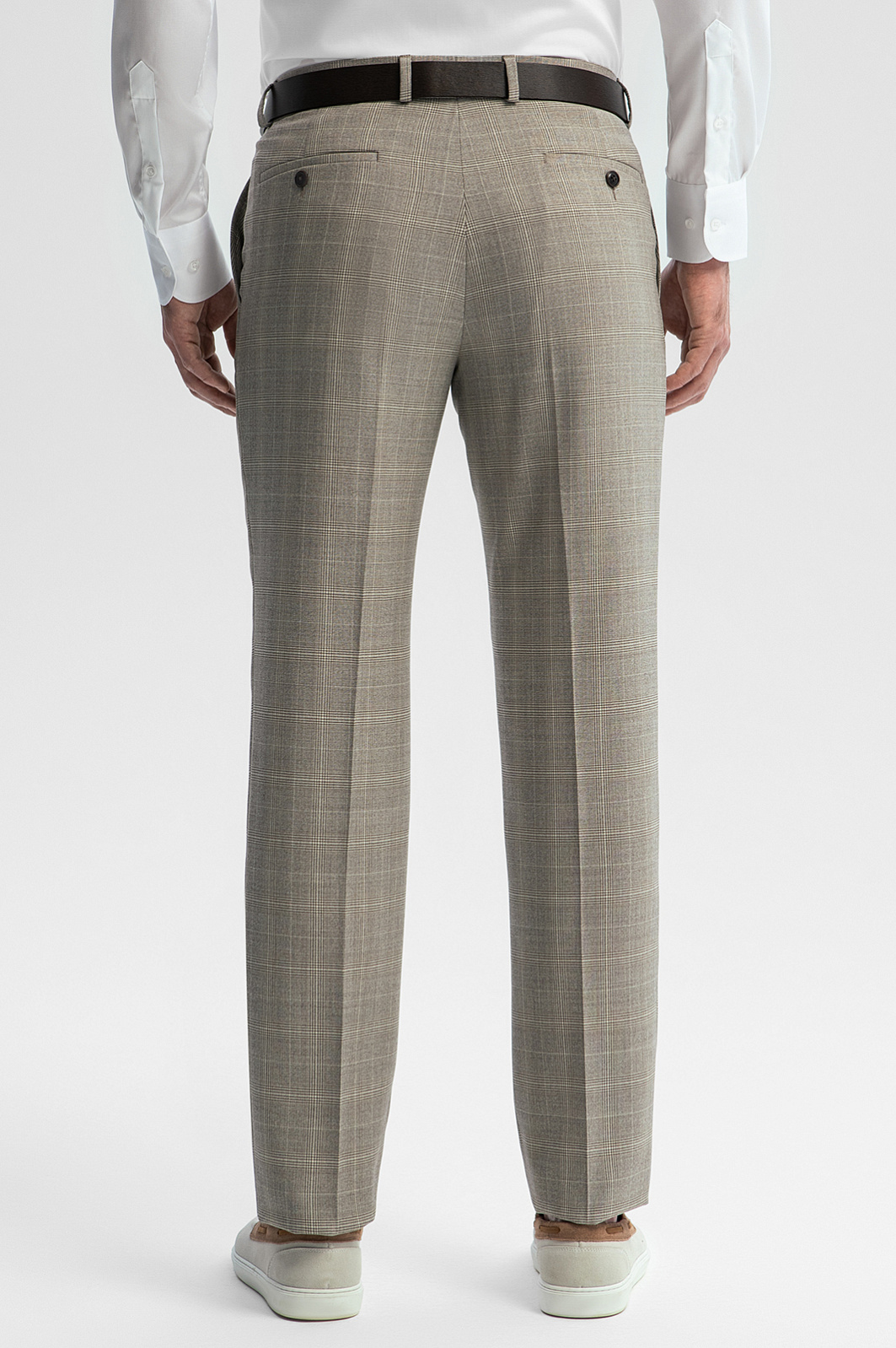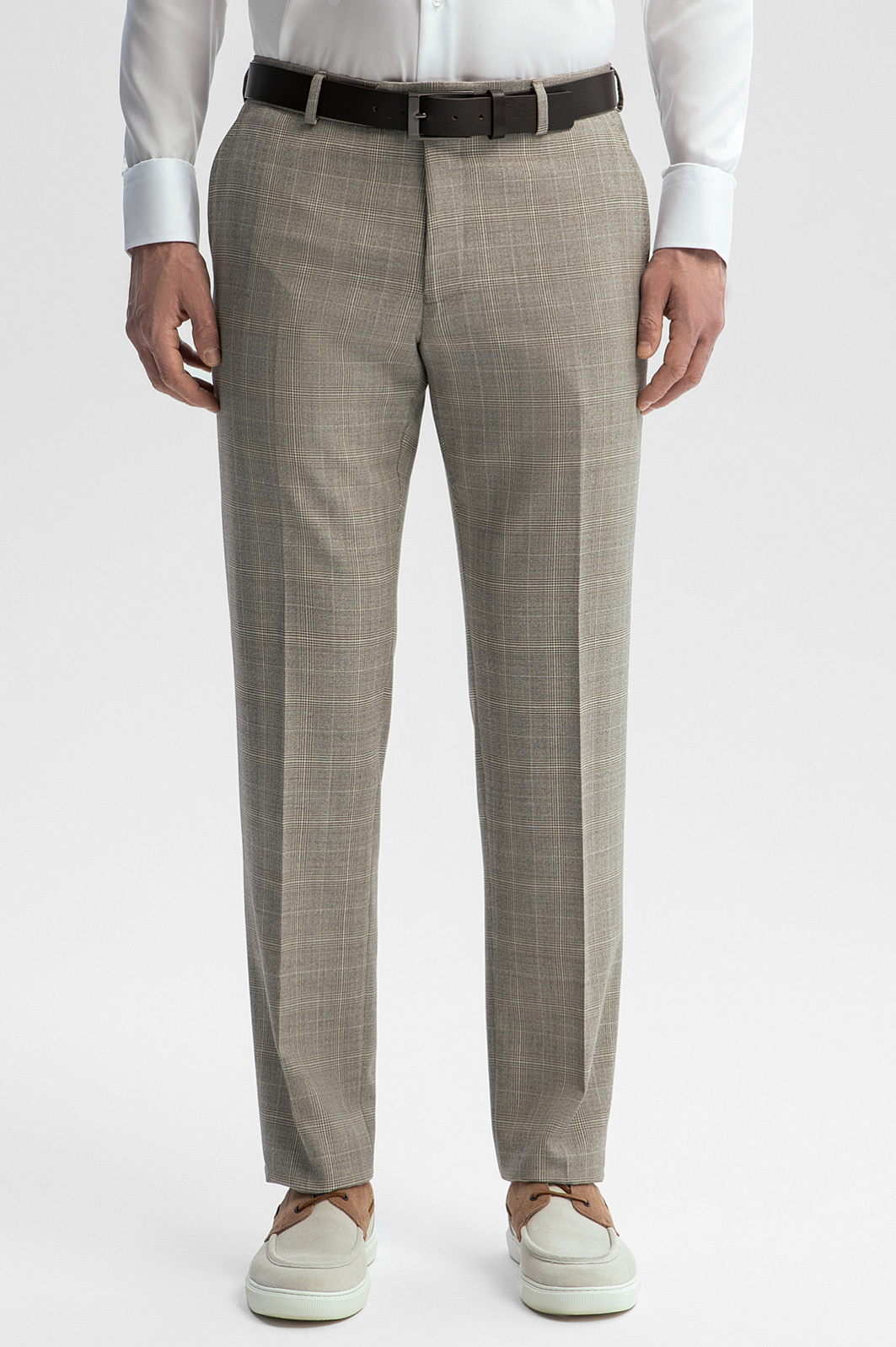 Классические серо-бежевые брюки KANZLER в клетку из тонкой шерсти Cупер 120S придают образу легкость и непринужденность. Это отличный выбор для офиса и неофициальных случаев, требующих элегантности. Слегка зауженный силуэт делает фигуру легче, стрелки задают вертикальные линии и визуально удлиняют ноги. Модель сшита из дорогой костюмной шерсти, которая адаптируется к изменениям температуры, обеспечивая телу комфорт. Прочные упругие волокна поддерживают форму и практически не мнутся. Для создания костюма-двойки брюки можно дополнить однобортным пиджаком KANZLER из такой же ткани.