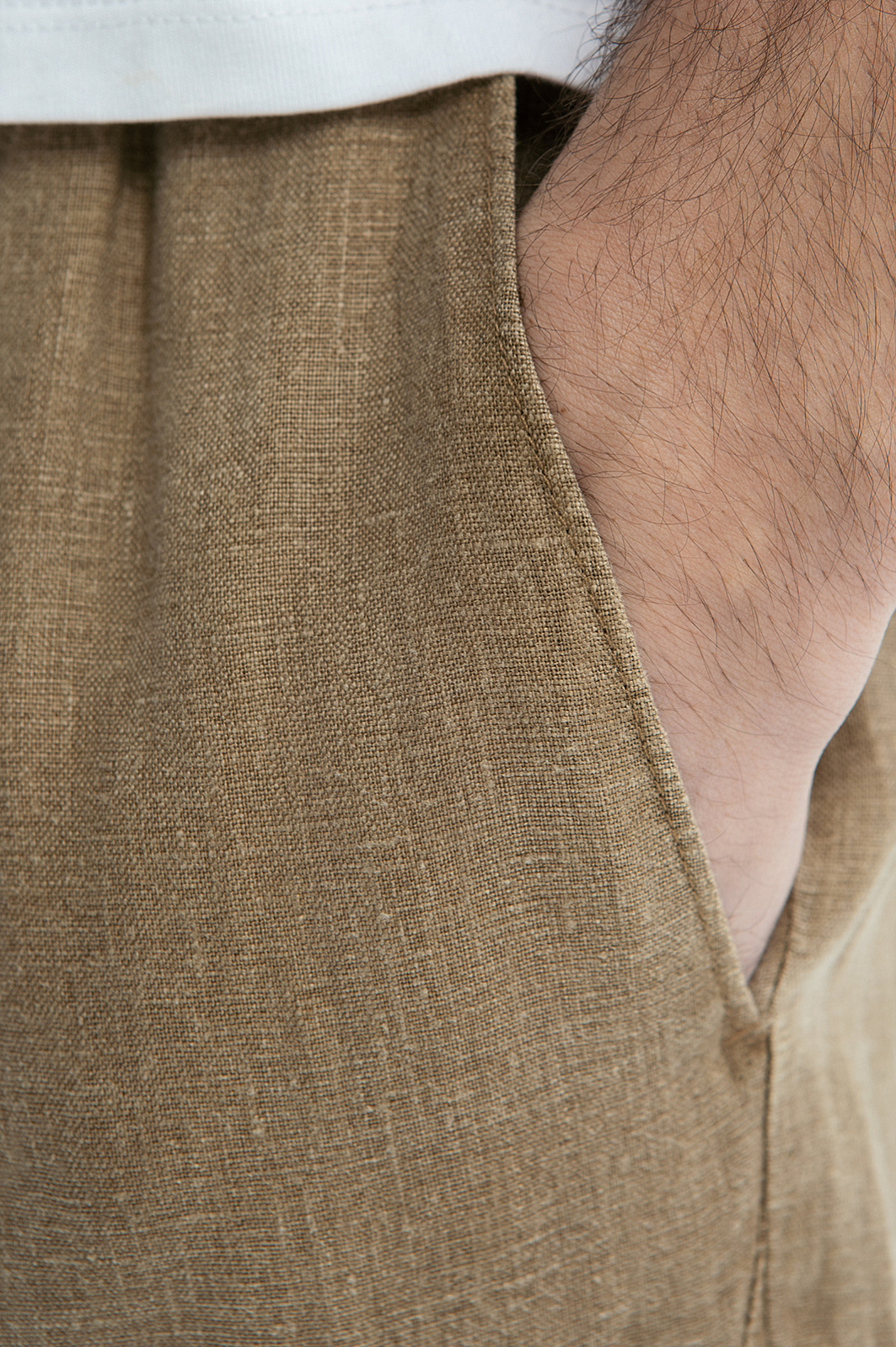 Брюки KANZLER тёплого бежевого оттенка из чистого льна воплощают сдержанную элегантность и бескомпромиссный комфорт, которые характерны для вещей из лимитированной коллекции. Свободный крой делает движения лёгкими и непринуждёнными. Небольшие защипы у пояса служат аккуратной посадке. Боковые и задние карманы подчёркивают функциональность модели. Брюки сшиты из льняной ткани, которая отличается слегка шероховатой текстурой. Натуральные гипоаллергенные волокна поддерживают циркуляцию воздуха и сохраняют ощущение прохлады в знойные дни.