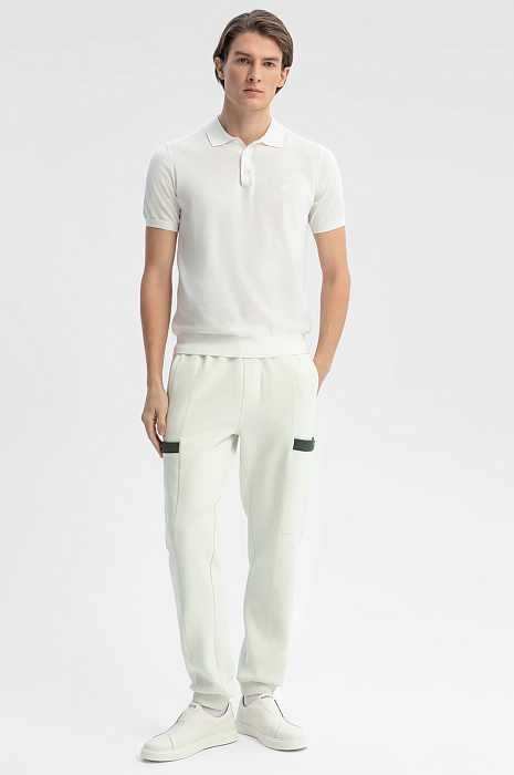 Светло-бежевые брюки KANZLER на кулиске из плотного хлопкового трикотажа — удобная спортивная модель для отдыха в теплые дни. Вертикальные швы придают модели структурность. Шнурок на поясе позволяет регулировать объем талии. Акцентные детали — контрастные темно-серые вставки, расположенные по краю карманов на бедрах. Модель выполнена из мягкого дышащего гипоаллергенного хлопка (80%), упрочненного полиэстером. Небольшая добавка спандекса служит для поддержания формы и адаптации к индивидуальным особенностям фигуры. Параметры модели: рост 191, 97-77-99 Размер на модели: M