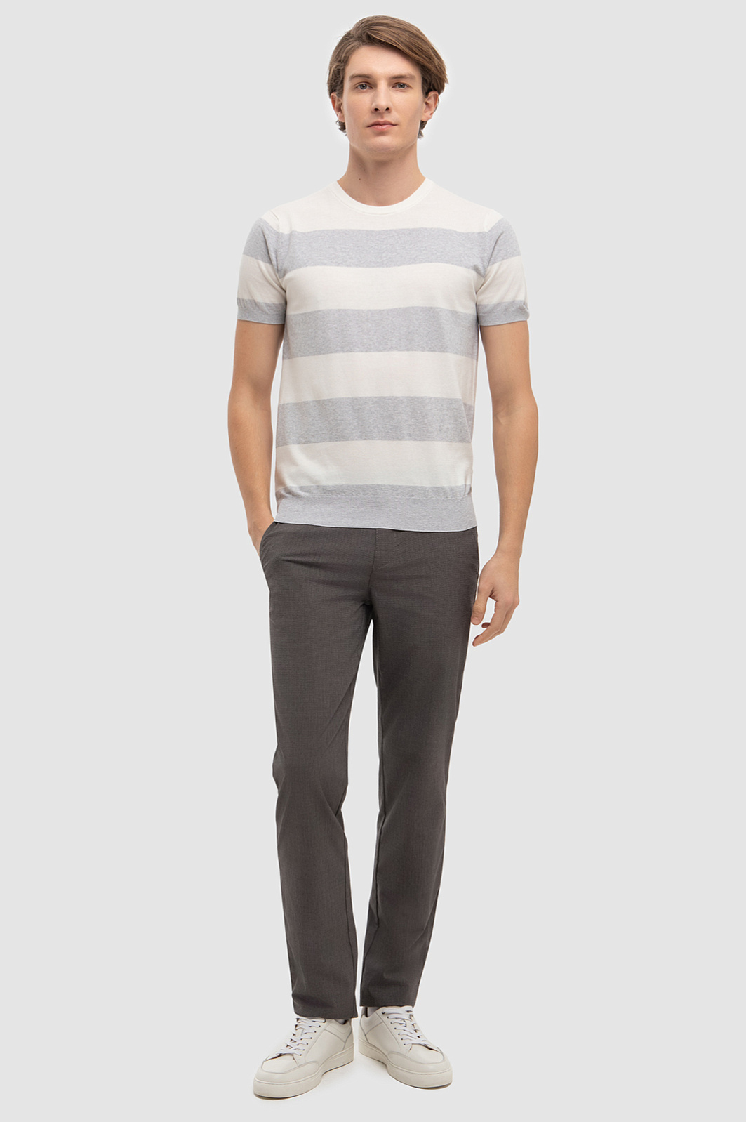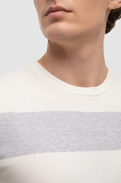 В этом году принт в полоску особенно актуален, поэтому в коллекции появился светлый джемпер KANZLER в широкую серую полоску. Легкую модель с круглым вырезом и коротким рукавом выполнили из премиального хлопкового трикотажа. Длинноволокнистый, собранный вручную хлопок Пима обеспечивает оптимальный микроклимат, исключительную прочность, нежность и деликатный блеск. Благодаря своей благородной расцветке изделие гармонично впишется в повседневный образ со строгими однотонными брюками или джинсами. Нежная ткань превращает этот джемпер в незаменимого повседневного спутника и обеспечивает тактильно приятные ощущение при носке. Параметры модели: рост 191, 97-77-99 Размер на модели: M