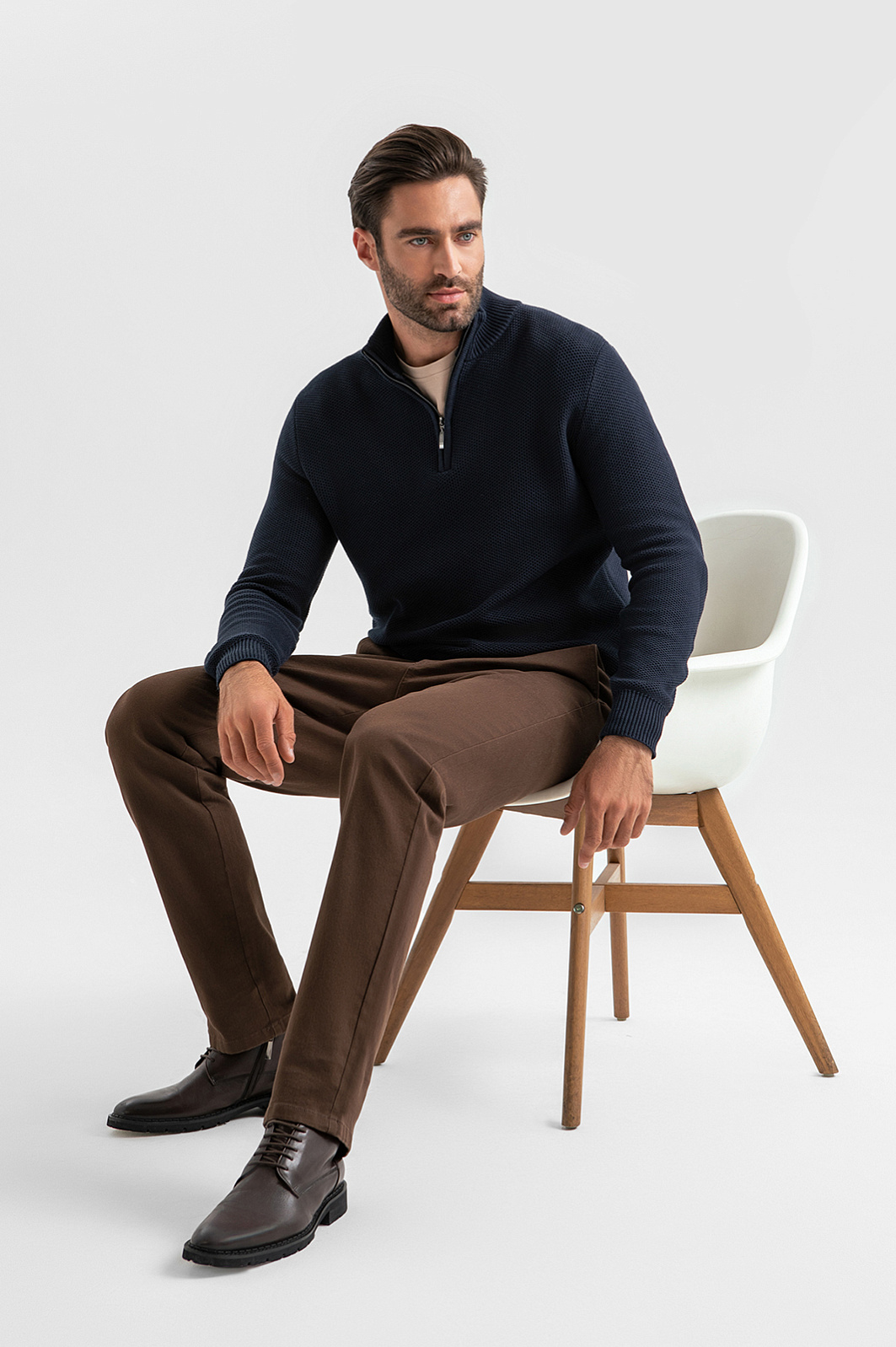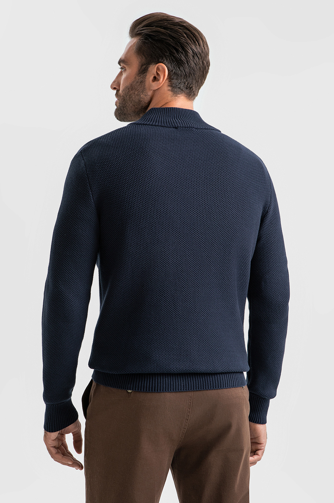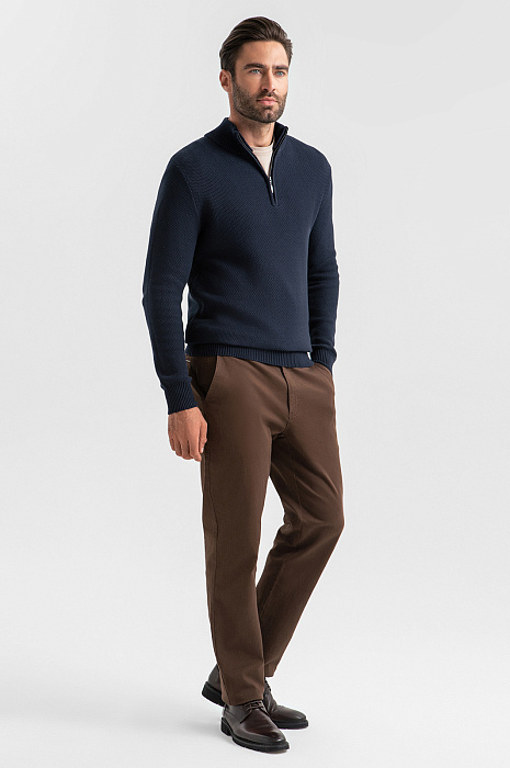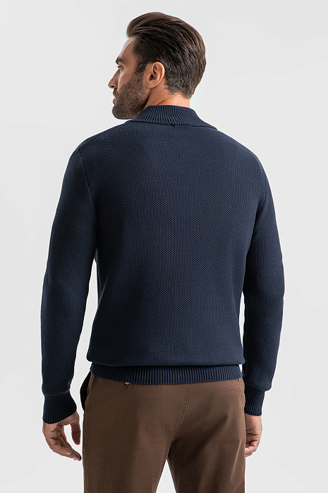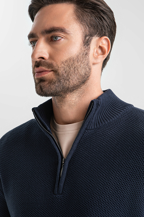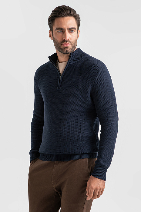 Комфортный джемпер KANZLER на каждый день — слегка свободный, мягко облегающий фигуру, плотный, с аккуратным и практичным вырезом и застежкой на молнию. Практичная модель изготовлена из мягкой и легкой натуральной шерсти с плотным переплетением нитей, придающего трикотажу оригинальную вафельную фактуру. Благородный Синий оттенок легко вписать в гардероб, а благодаря оптимальной длине джемпер можно носить и с джинсами, и с брюками. Наши стилисты советуют носить модель в паре с белой футболкой для создания многослойного комплекта. Параметры модели: рост 192, 108-83-102 Размер на модели: M