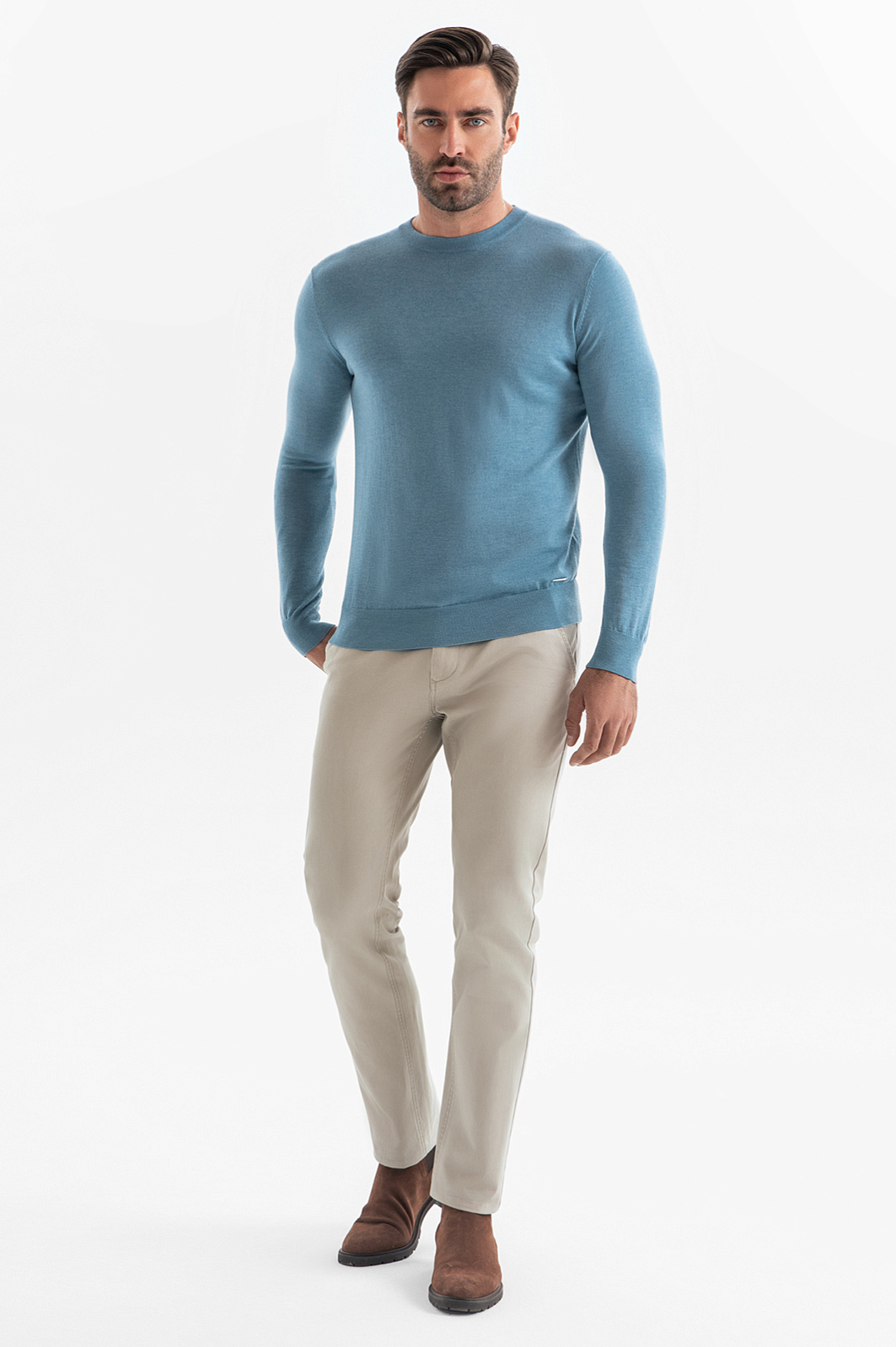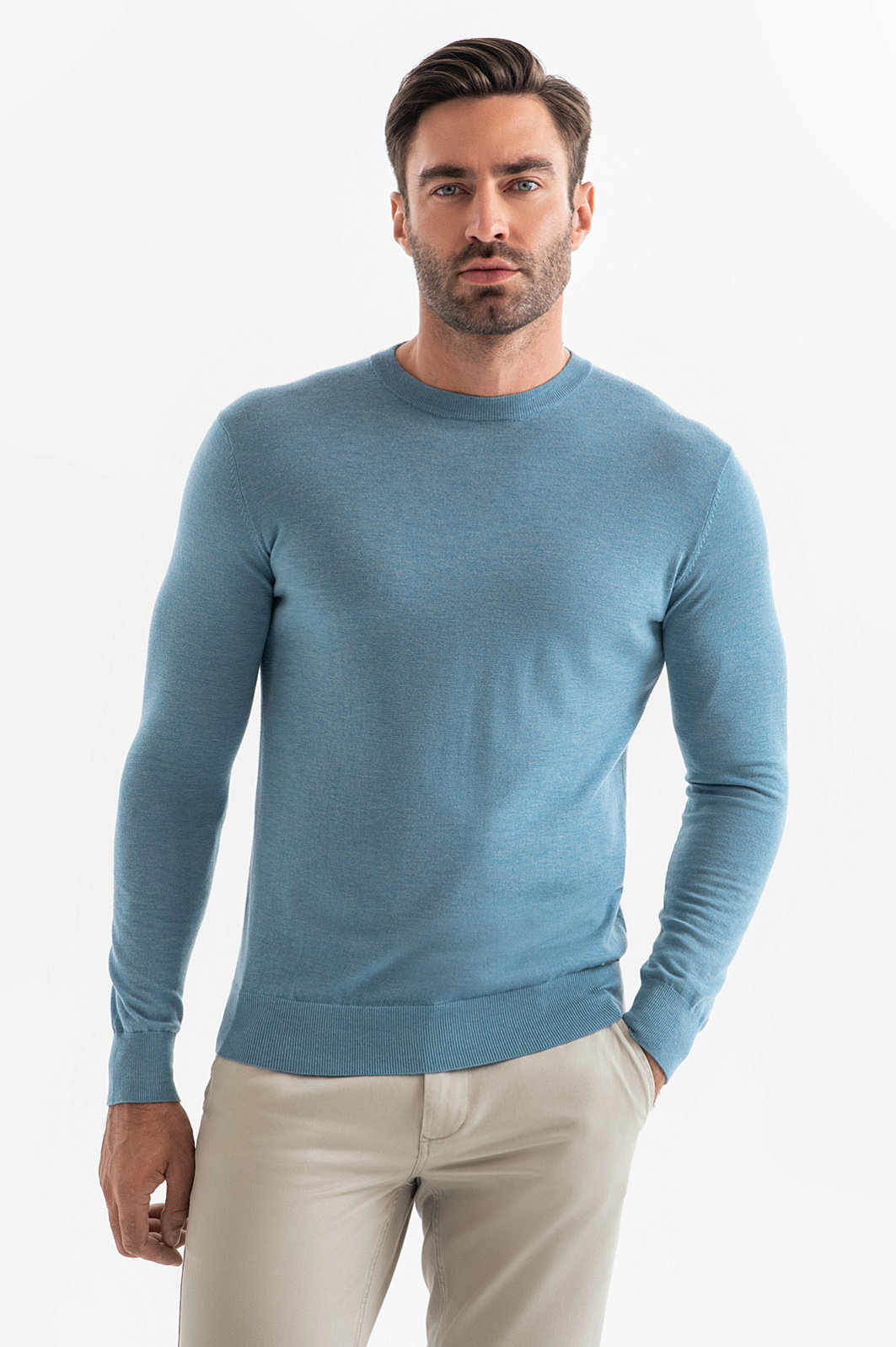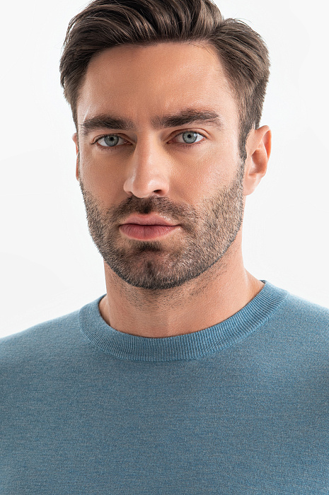 Джемпер в красивом приглушенном голубом оттенке может стать ключевой деталью образа. Для изготовления модели использовали тонкую нежную шерсть с добавлением ценного кашемира. Шерсть обладает отличными теплоизоляционными свойствами и обеспечивает хорошую воздухопроницаемость, а кашемир премиального качества добавляет изделию особую мягкость и роскошную текстуру. Изделие получилось легким, теплым и приятным на ощупь. Джемпер KANZLER c круглым воротом и длинными рукавами гармонично впишется в продуманный мужской гардероб. Параметры модели: рост 192, 108-83-102 Размер на модели: M