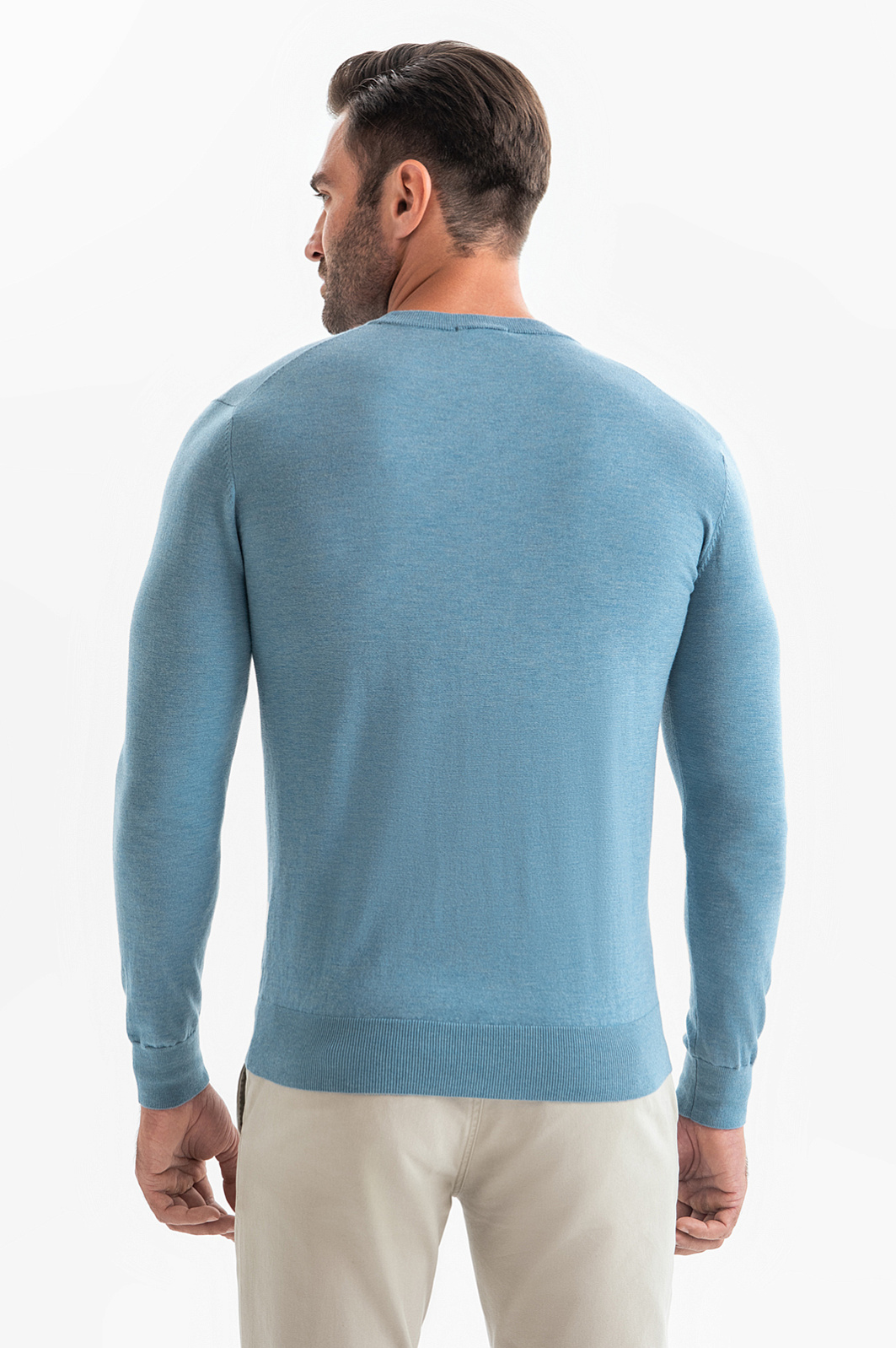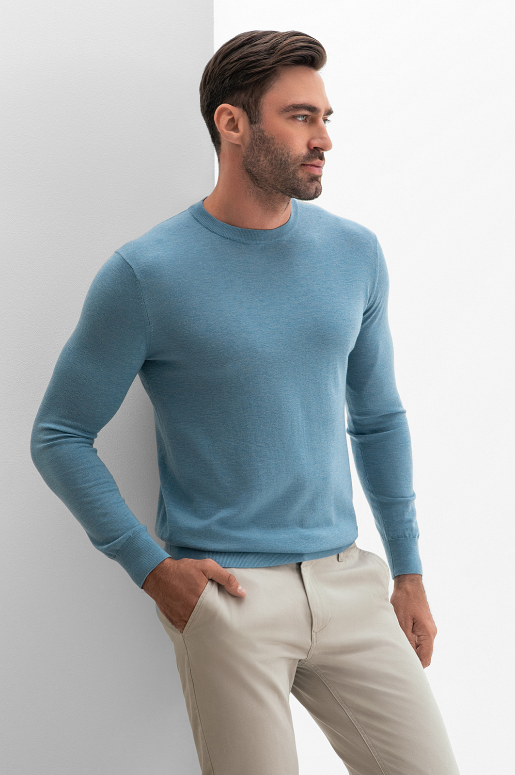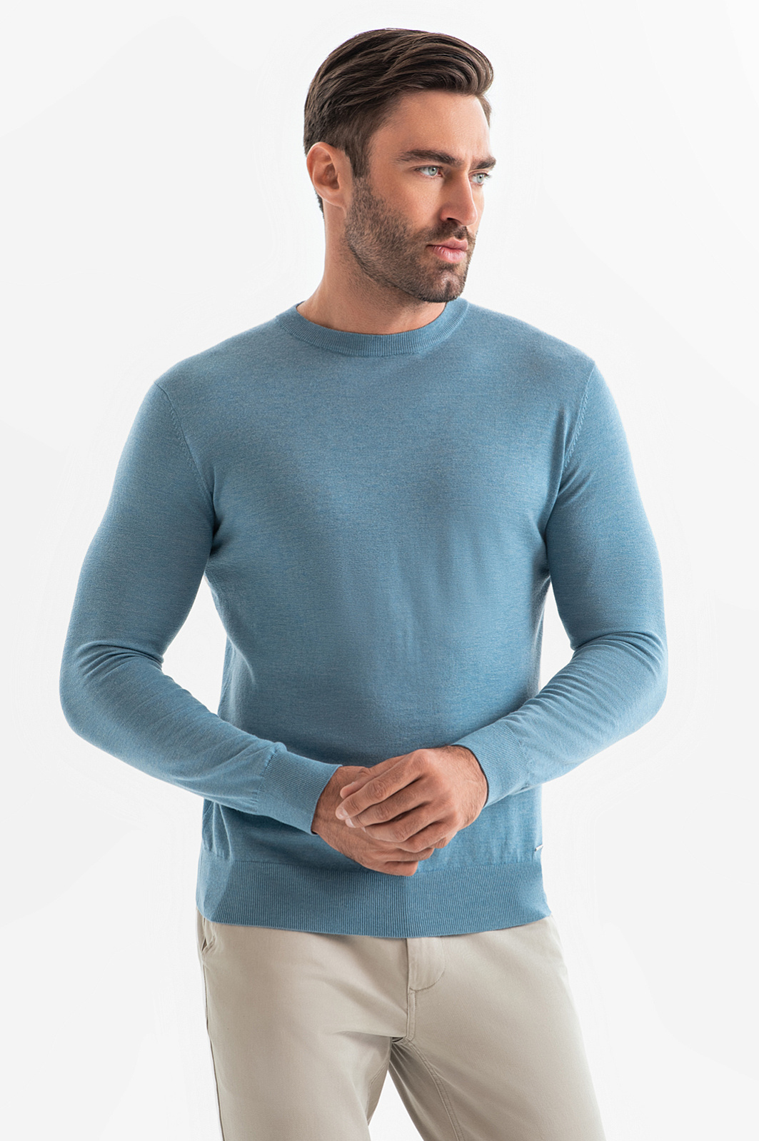 Джемпер в красивом приглушенном голубом оттенке может стать ключевой деталью образа. Для изготовления модели использовали тонкую нежную шерсть с добавлением ценного кашемира. Шерсть обладает отличными теплоизоляционными свойствами и обеспечивает хорошую воздухопроницаемость, а кашемир премиального качества добавляет изделию особую мягкость и роскошную текстуру. Изделие получилось легким, теплым и приятным на ощупь. Джемпер KANZLER c круглым воротом и длинными рукавами гармонично впишется в продуманный мужской гардероб. Параметры модели: рост 192, 108-83-102 Размер на модели: M