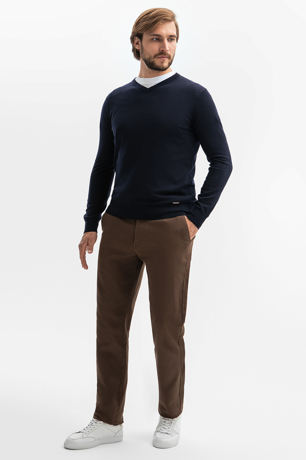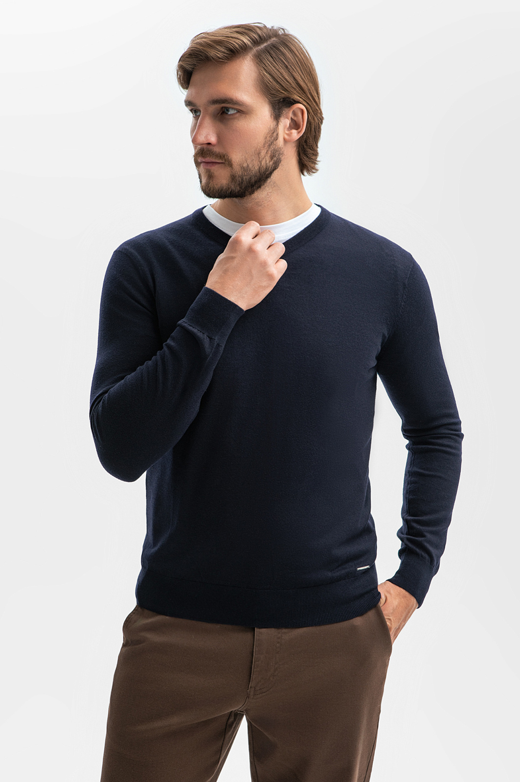 Пуловер KANZLER связали из тонкой шерстяной пряжи с добавлением нежного кашемира для особенной мягкости и тепла. Шерсть обладает отличными теплоизоляционными свойствами, регулирует температуру тела и обеспечивает хорошую воздухопроницаемость. Кашемир добавляет изделию особую мягкость и роскошную текстуру. Гипоаллергенный материал получился чрезвычайно лёгким - благодаря чему пуловер можно носить на голое тело, ощущая максимальный комфорт. треугольный вырез вытягивает силуэт, делая образ более элегантным и стройным, а универсальный Синий оттенок позволяет легко сочетать эту модель с различными предметами гардероба, обеспечивая безупречный стиль в любых ситуациях. В качестве декора дизайнеры использовали небольшой металлический патч с логотипом бренда, который добавляет акцента и подчеркивает внимание к деталям. Джемпер KANZLER отлично подходит для создания многослойных комплектов. Параметры модели: рост 187, 100-81-97 Размер на модели: M