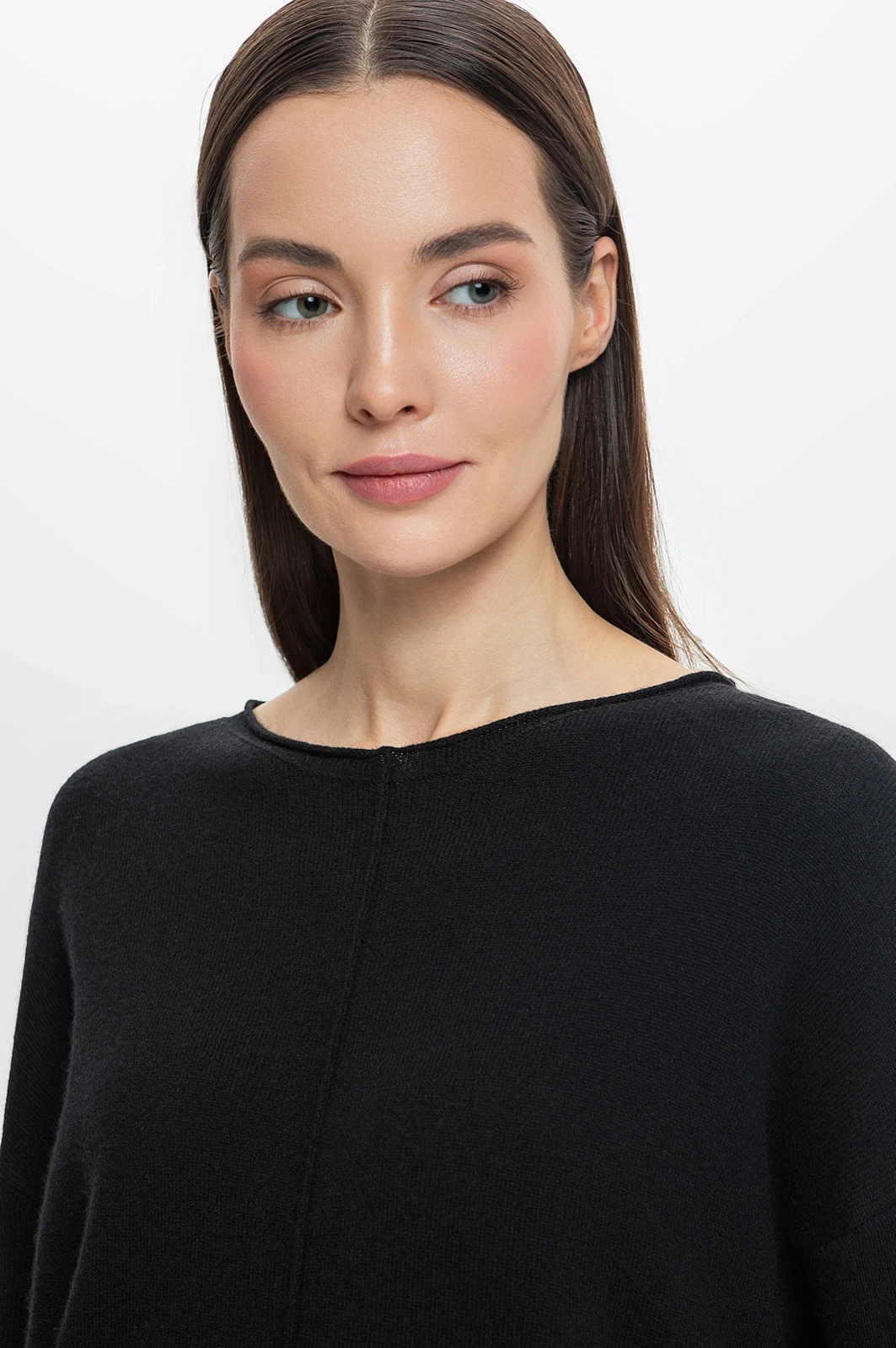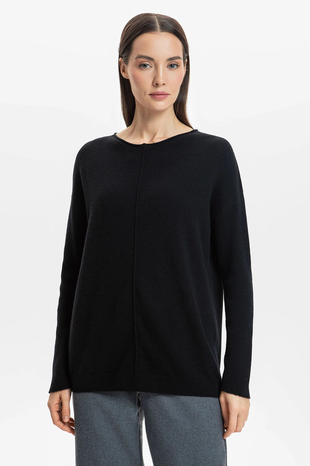 Изысканный женский черный джемпер, созданный из премиального смесового материала (70% шерсти и 30% кашемира), станет абсолютной необходимостью в гардеробе. Его элегантный и минималистичный дизайн подходит для любых случаев: от офисного стиля до расслабленного вечера с друзьями. Мягкая текстура материала и свободный крой дарят ощущение комфорта, а терморегулирующие свойства шерсти и кашемира обеспечивают тепло в холодные дни. Джемпер отлично комбинируется с классическими брюками, юбками и даже джинсами, что делает его универсальным решением для разных ситуаций. Параметры модели: рост 177, 85-61-92 Размер на модели: S