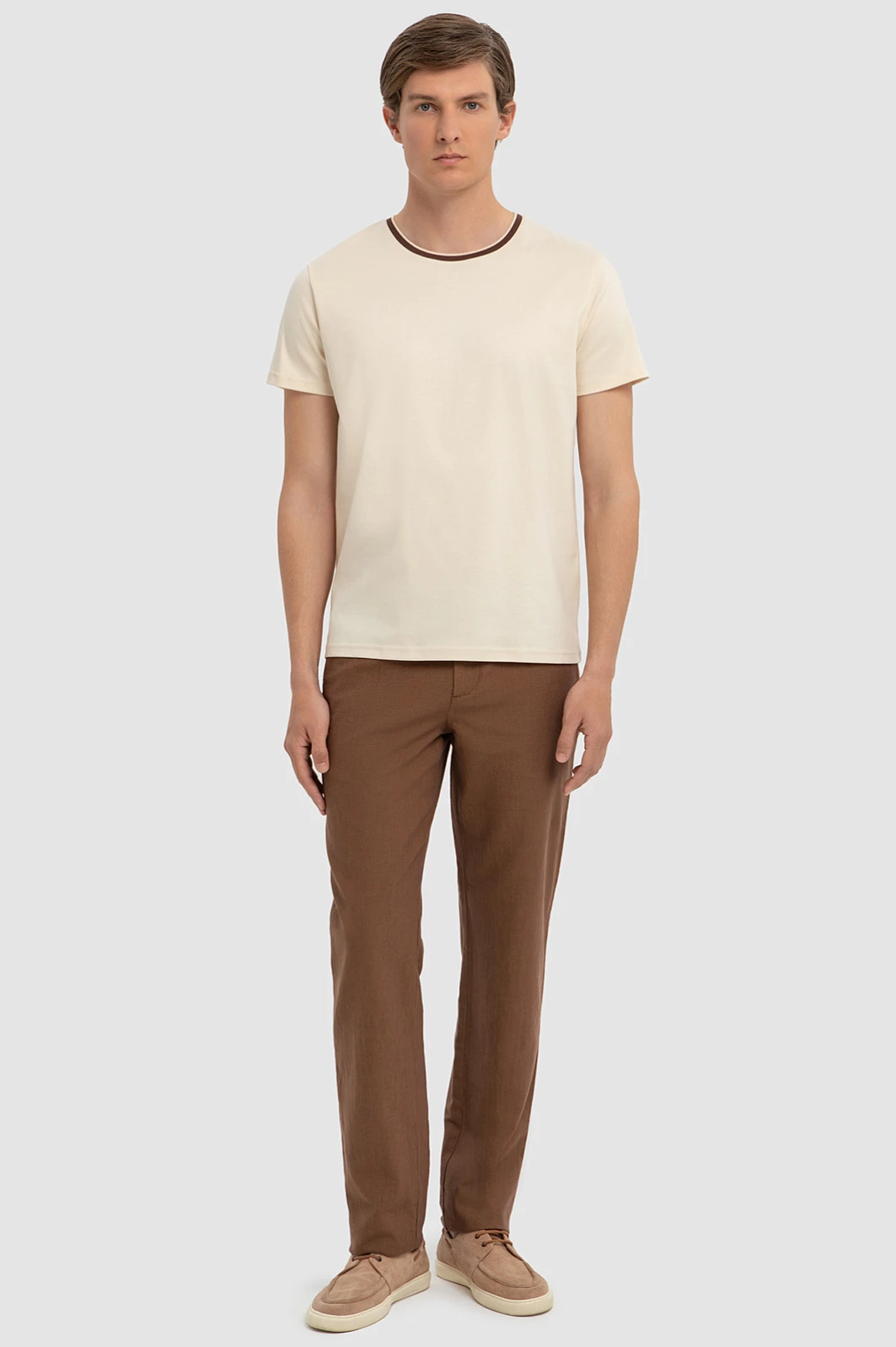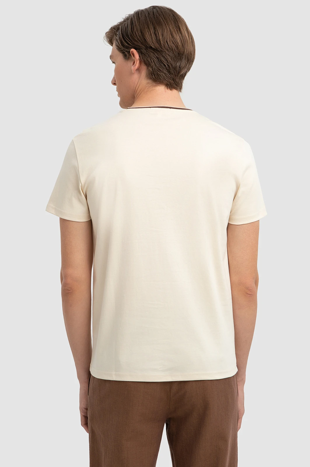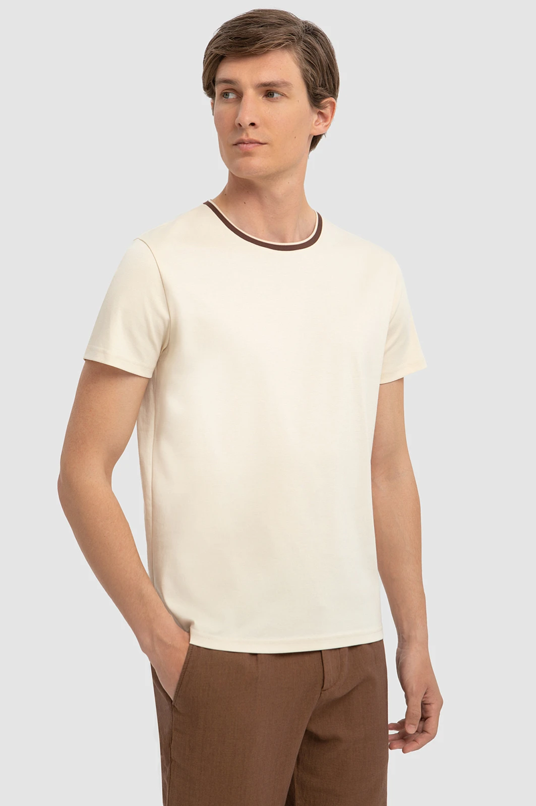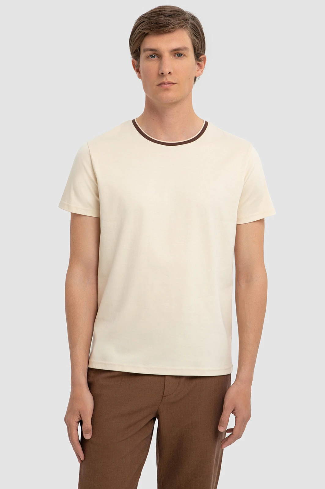 Светло-бежевая футболка KANZLER из 100-процентного хлопка с круглым вырезом, подчеркнутым коричневым кантом, идеально подходит для создания спокойных минималистичных образов в спортивном и повседневном стилях. Универсальная всесезонная футболка пригодится для прогулок, поездок и путешествий. Гладкий трикотаж мягко облегает тело, не ограничивая свободу движений. Натуральная ткань создана из невесомых гипоаллергенных волокон хлопка, которые поддерживают циркуляцию воздуха и комфортную для тела температуру.