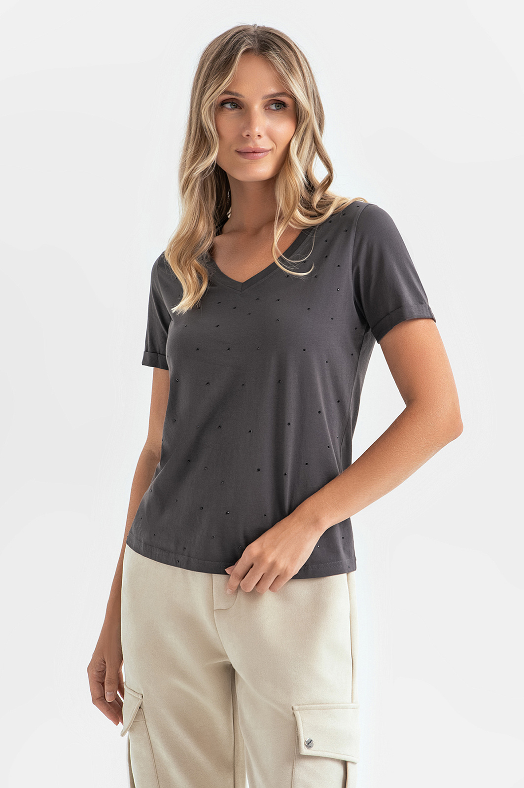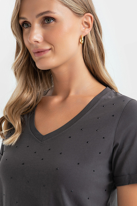 Серая футболка KANZLER из чистого хлопка, в которой органично сочетаются шик и повседневный комфорт, — блестящий пример стиля кежуал гламур, рожденного в результате движения гламура и спорта навстречу друг другу. Нарядность модели придают темные мерцающие стразы. Треугольный вырез удлиняет шею и подчеркивает женственность. Удобной футболку делают умеренно свободный крой и легкий качественный трикотаж из 100-процентного хлопка. Его натуральные гипоаллергенные волокна пропускают воздух, отводят лишнюю влагу и поддерживают комфортную для тела температуру. Параметры модели: рост 180, 87-61-91 Размер на модели: S