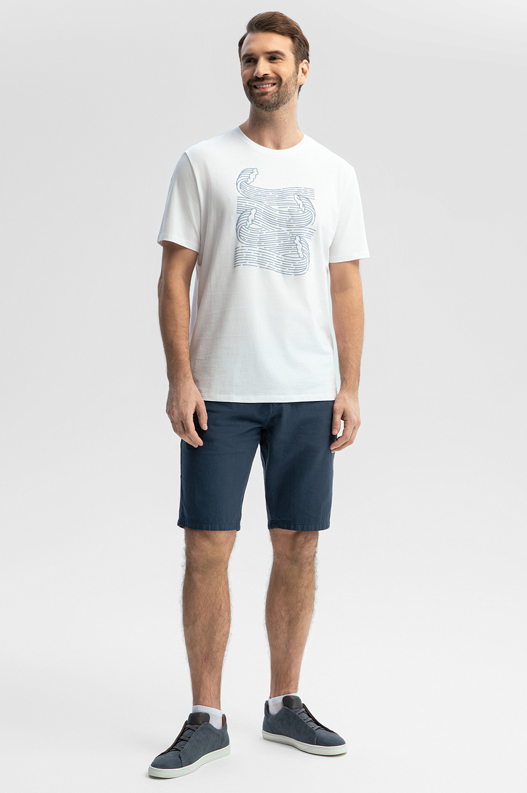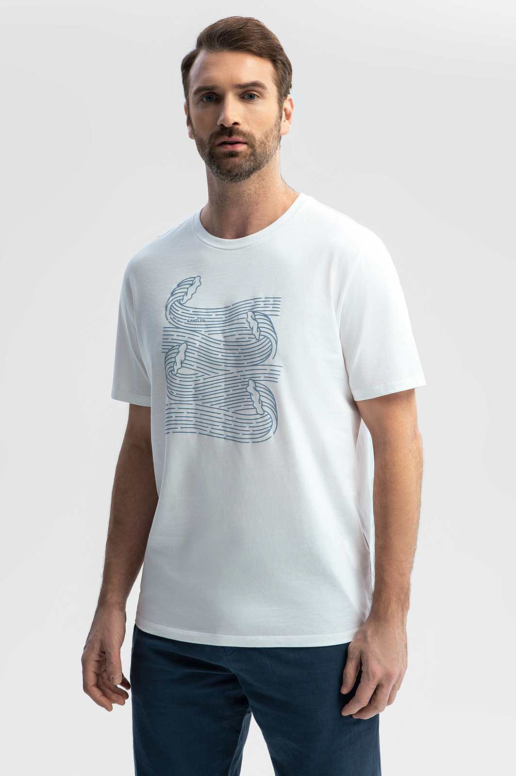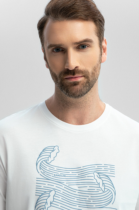 Белая футболка KANZLER с морским принтом – ваш персональный океан, который всегда рядом. Волны, словно застывшие в движении, добавляют образу динамики и вдохновляют отправиться в путешествие. Модель выполнили из экологичного 100-процентного хлопка, нежно обволакивающего кожу. Гипоаллергенный материал обеспечивает комфорт в течение всего дня, не вызывая раздражений. Свободный крой – идеальный выбор для любых летних активностей – сохраняет свободу, не ограничивая движений. Сочетайте модель с брюками для повседневного городского образа или дополните бермудами и сандалиями для прогулки по набережной. Параметры модели: рост 189, 102-80-99 Размер на модели: M