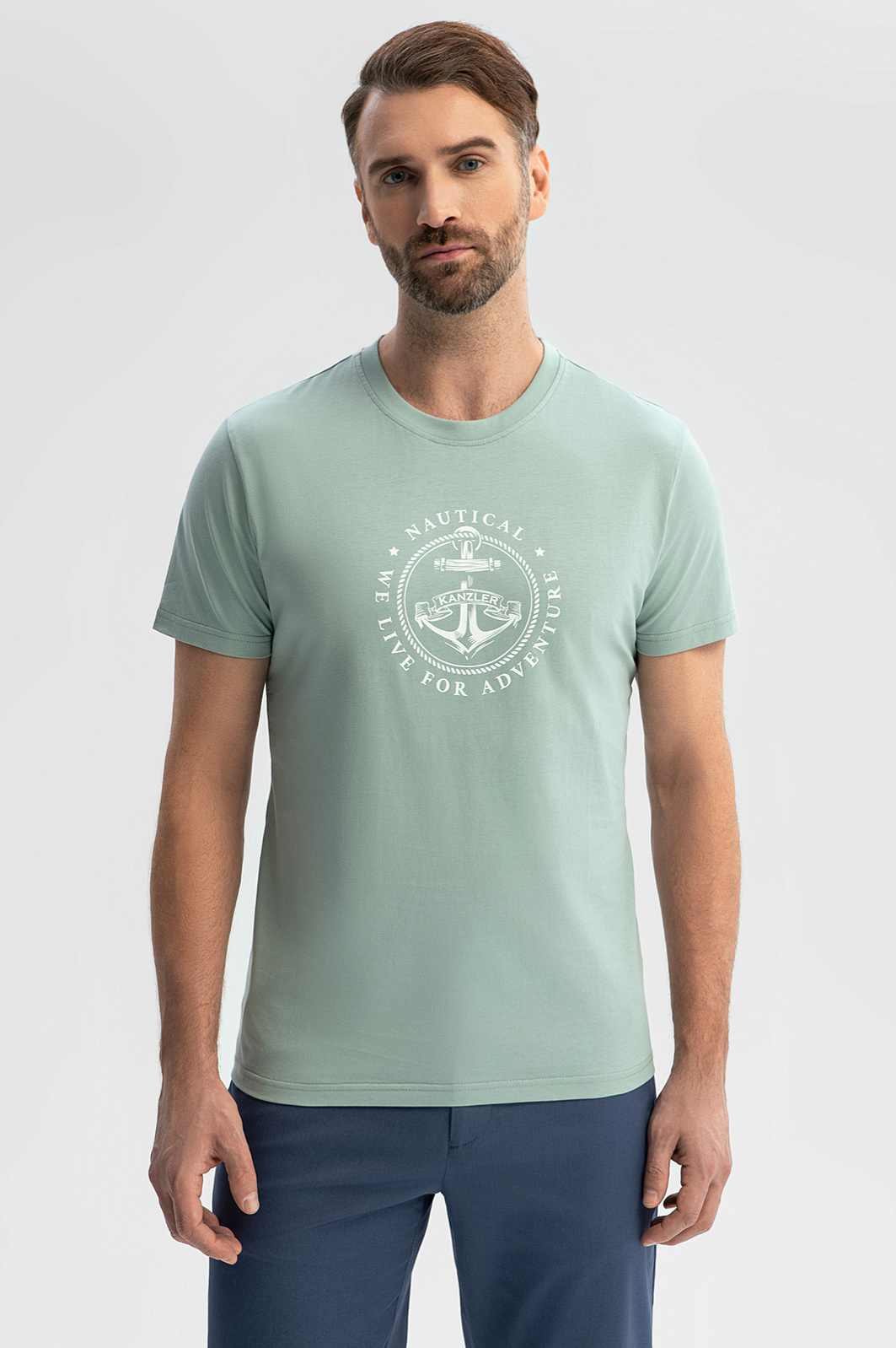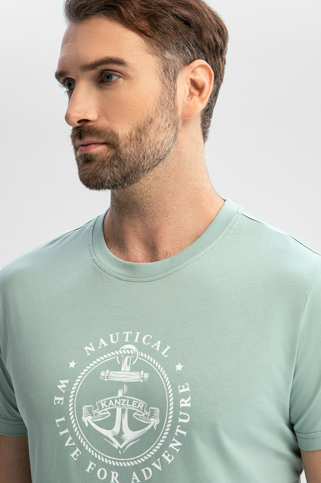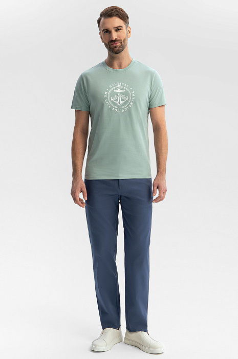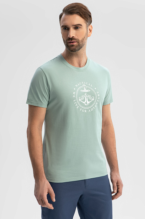 Футболку KANZLER приятного мятного оттенка из чистого хлопка с морским принтом на груди стоит захватить с собой на отдых, в путешествие. Она хорошо сочетается с легким золотистым загаром и отпускным настроением. Традиционный крой с прилегающим силуэтом подчеркивает достоинства фигуры. Ткань из 100-процентного хлопка — настоящий праздник для тела. Она хорошо тянется, не сковывая движений. Мягкие воздушные волокна не раздражают даже самую чувствительную кожу, обеспечивают телу комфортную температуру и защищают от жары. Параметры модели: рост 189, 102-80-99 Размер на модели: M