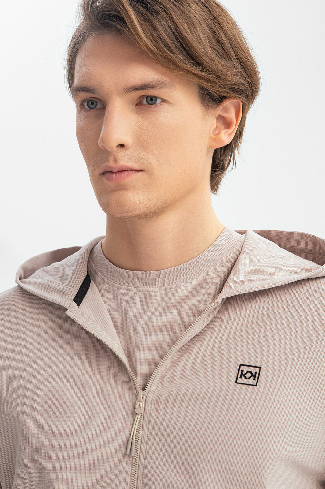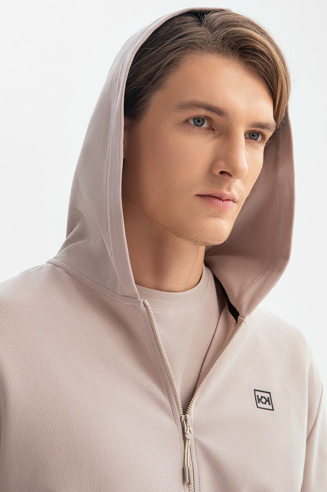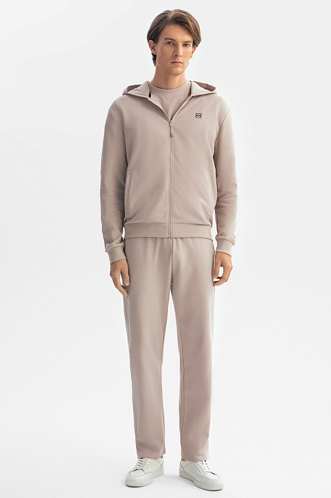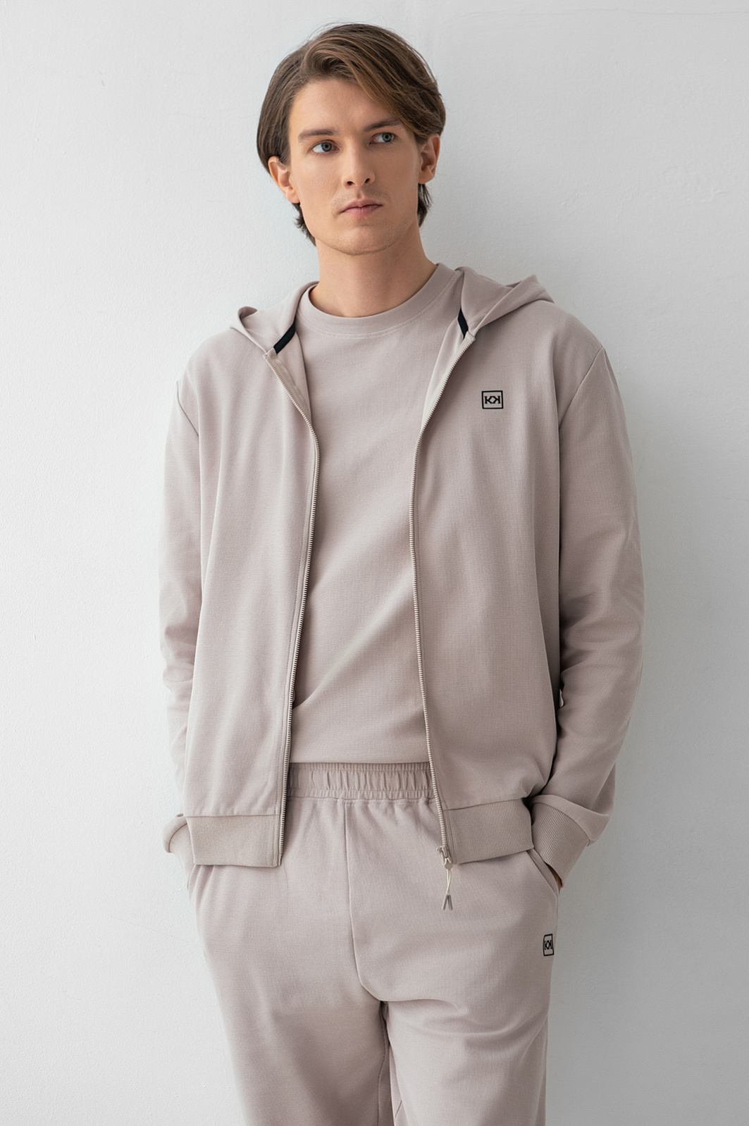 На создание светло-бежевого костюма KANZLER из хлопка дизайнеров вдохновили обитатели дорогих европейских курортов. Он располагает к безмятежному отдыху — позднему завтраку, приятным домашним делам и неспешной прогулке по окрестностям в поисках порции бодрящего кофе. Комплект составлен из толстовки на молнии с капюшоном и свободных удобных брюк. Современный минималистичный характер подчеркивают лаконичные детали, небольшой фирменный логотип и функциональный крой. Мягкий воздухопроницаемый гипоаллергенный хлопок (95%) обеспечивает телу комфорт. Небольшая добавка спандекса укрепляет материал и помогает сохранять форму.