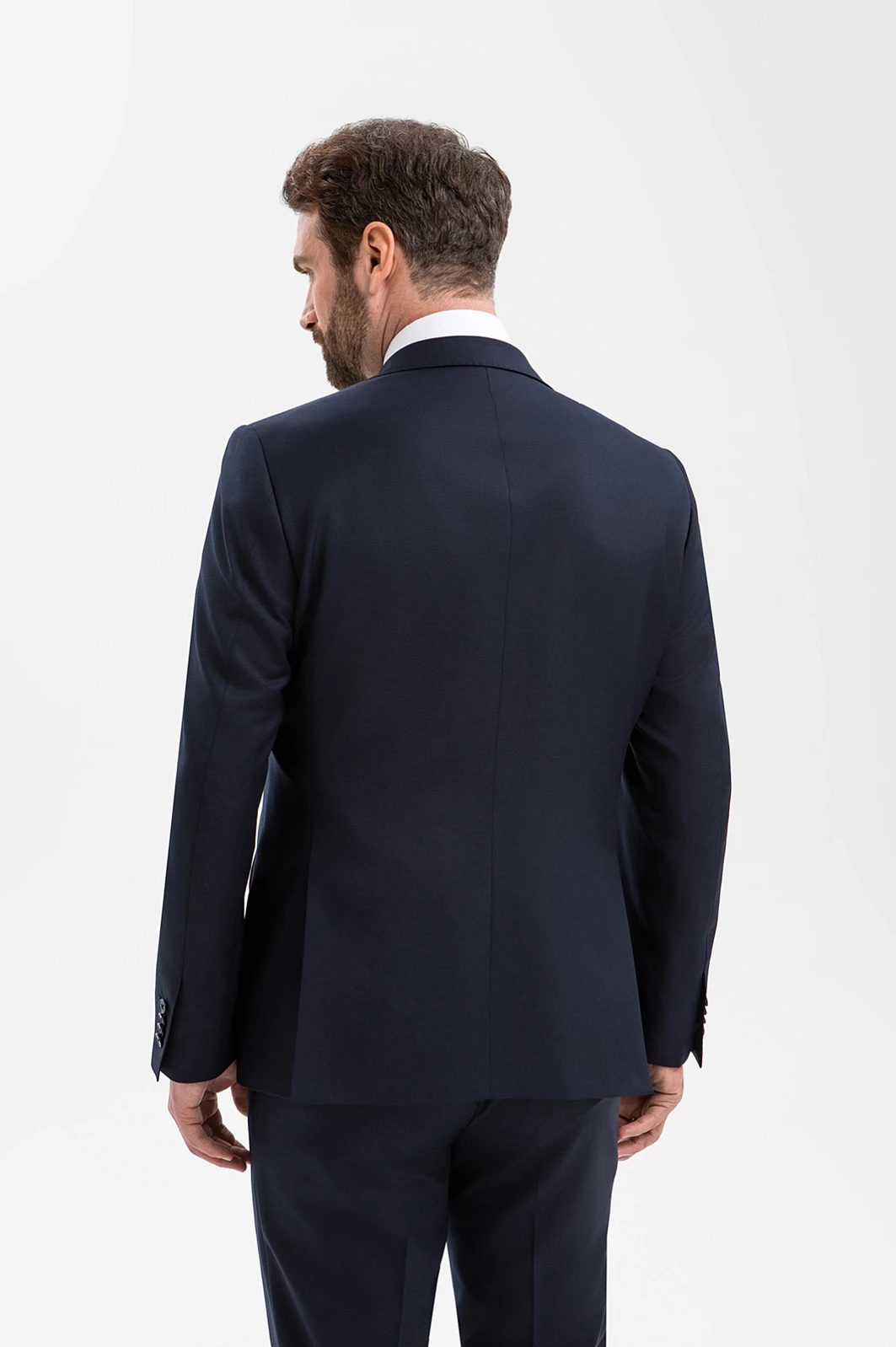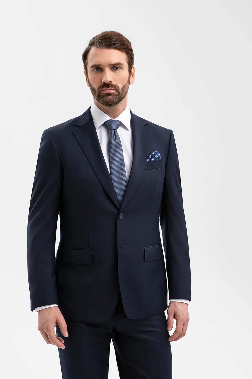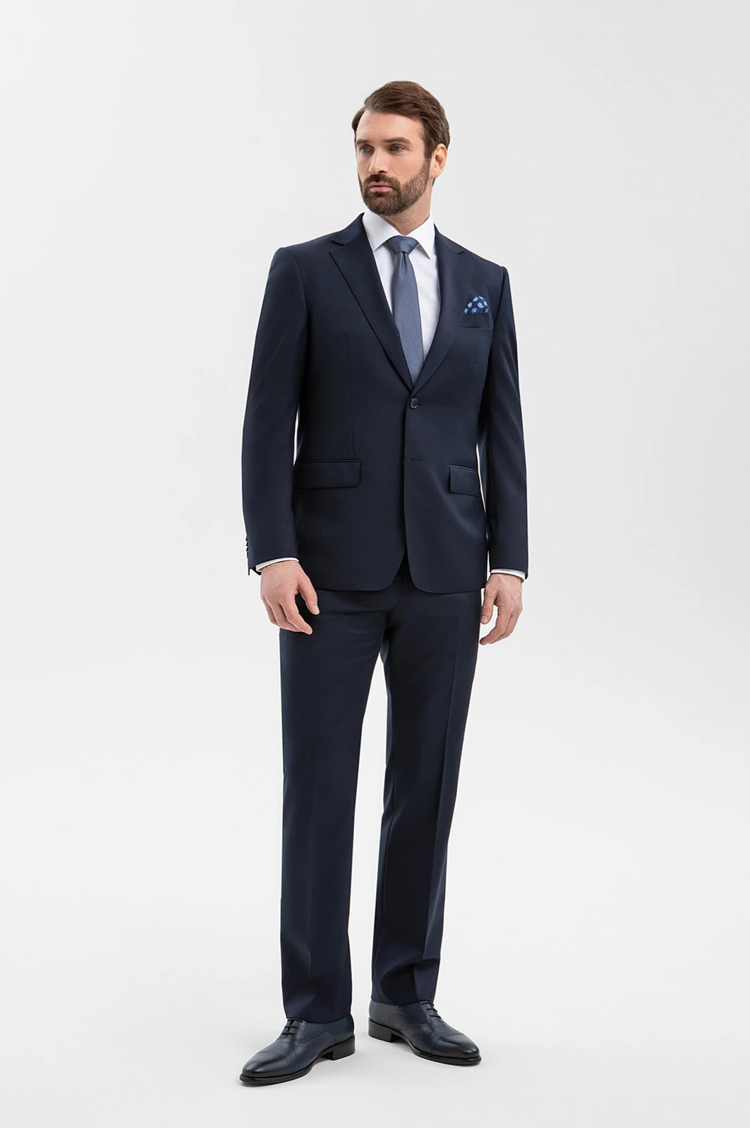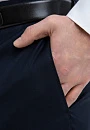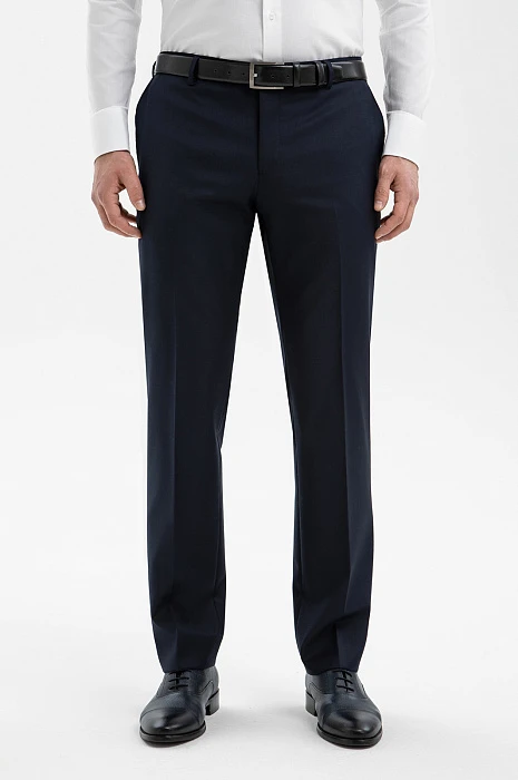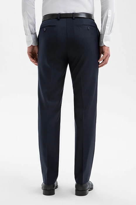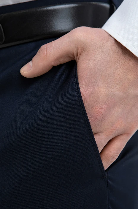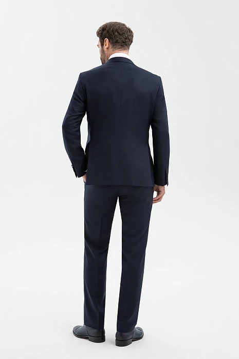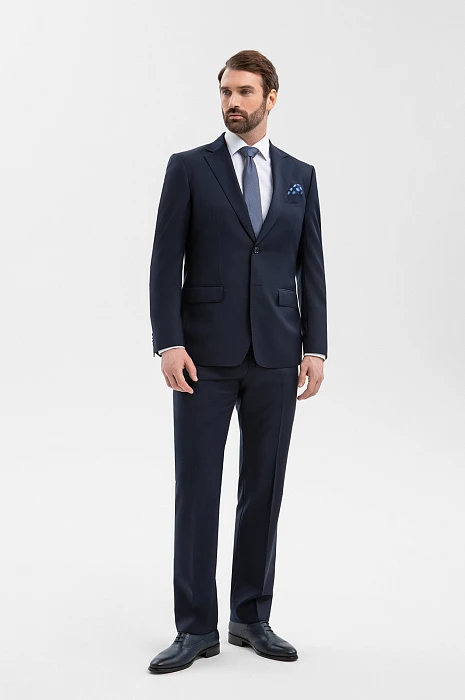 Элегантный тёмно-синий костюм KANZLER из смесовой шерсти мериноса подчёркивает принадлежность к деловому миру, создавая образ лидера и профессионала. Выверенный силуэт, сдержанный цвет и благородная фактура ткани говорят о вкусе и уверенности. Современный слегка зауженный крой костюмной пары сочетаются с традиционными деталями — клапанами на карманах пиджака и стрелками на брюках. В составе высококачественной ткани — шелковистая гипоаллергенная шерсть мериноса, которая бережёт естественное тепло и защищает тело от перегревания, и прочный полиэстер, делающий материал устойчивым к сминанию и износу.