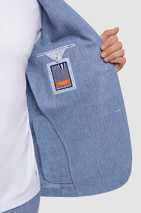 При создании костюма KANZLER с легким меланжевым эффектом дизайнеры использовали тонкий смесовый материал на основе дышащего хлопка и охлаждающего льна (55% лен, 45%хлопок). Материал хорошо пропускает воздух, поддерживая комфортный микроклимат. Пиджак с прямоугольными лацканами и брюки с комфортной регулируемой посадкой на кулиске выкроили по классическим лекалам, добившись лаконичного строгого силуэта. Легкая конструкция пиджака, характерная для итальянской школы, делает посадку максимально комфортной. Благодаря облегченной подкладке пиджак получился более легким, а две шлицы сзади обеспечивают свободу движения. Благородный небесно-голубой комплект прекрасно дополнит образы с белыми кедами и прямой футболкой с круглым вырезом.