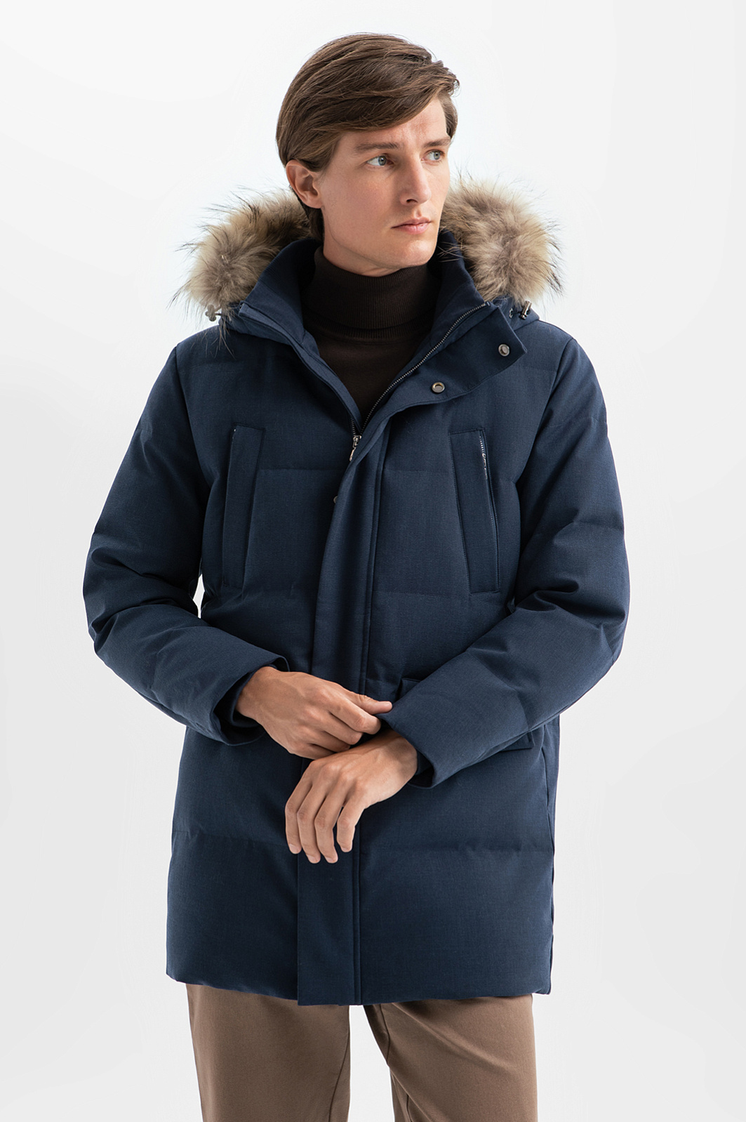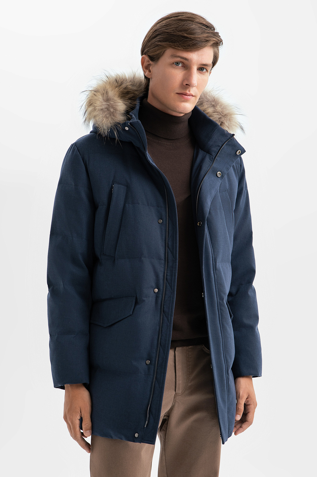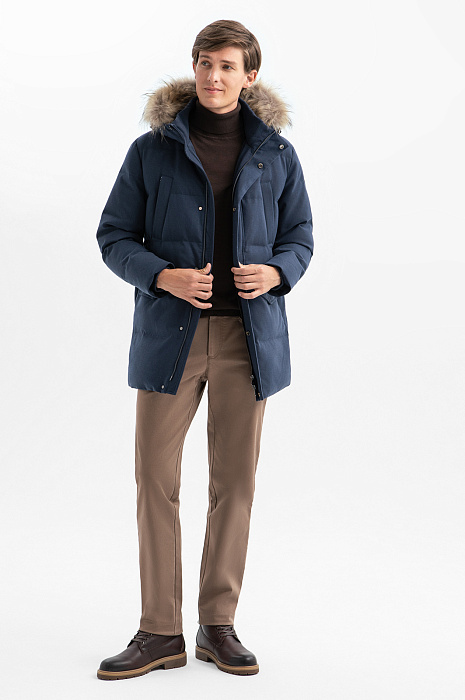 Теплая парка KANZLER спокойного серо-синего оттенка с капюшоном, отделанным пушистым натуральным мехом, обеспечивает оптимальный уровень комфорта в любых погодных условиях. Это универсальная модель, которая сочетается с одеждой в деловом и городском стилях. Если меховая отделка капюшона — это про красоту и романтику, то верх из плотного смесового материала из полиэстера с тенселом и шерстью и натуральный наполнитель из пуха (90%) с пером — про надежную защиту от холода и пронизывающего ветра. Параметры модели: рост 191, 97-77-99 Размер на модели: 50