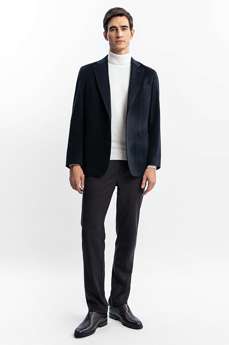 Темно-синий пиджак KANZLER из коллекции изысканной одежды из дорогих тканей — роскошь, созданная по канонам высокого портновского искусства из чистого кашемира — нежного натурального материала премиального качества. Мягчайшая ткань создает ощущение нежного заботливого прикосновения. Однобортный пиджак с прямыми лацканами и двумя шлицами сзади скроен достаточно свободно, чтобы не ограничивать движения. Обметка петлицы, ручной декоративный шов на подкладке, курсивная вышивка, рамка и атласный уголок на внутреннем кармане выполнены в шоколадно-коричневом оттенке. Прочная скользящая ткань подкладки облегчает надевание. Параметры модели: рост 192, 101-76-97 Размер на модели: 50