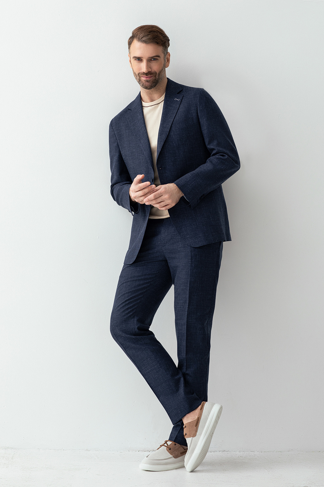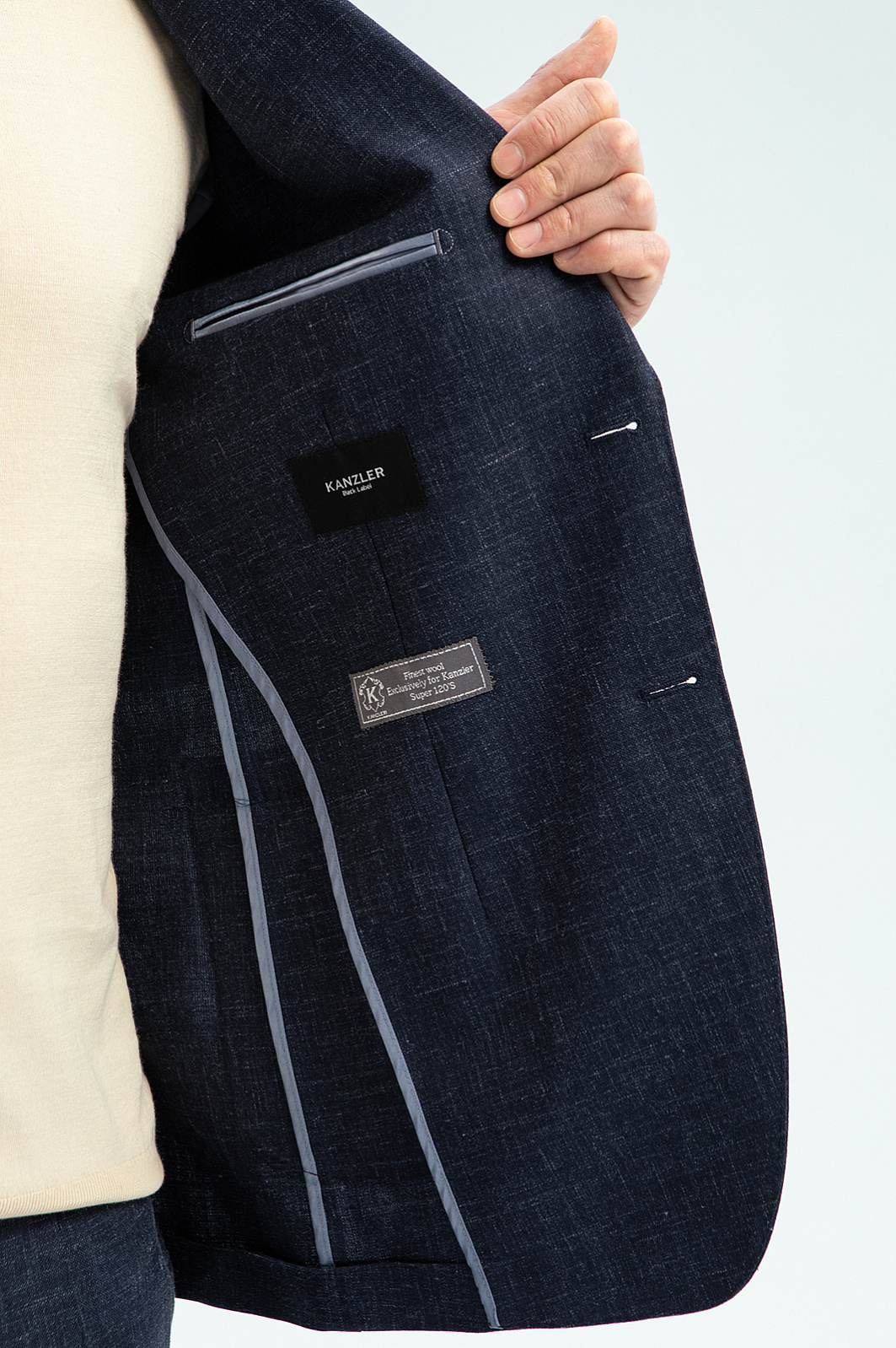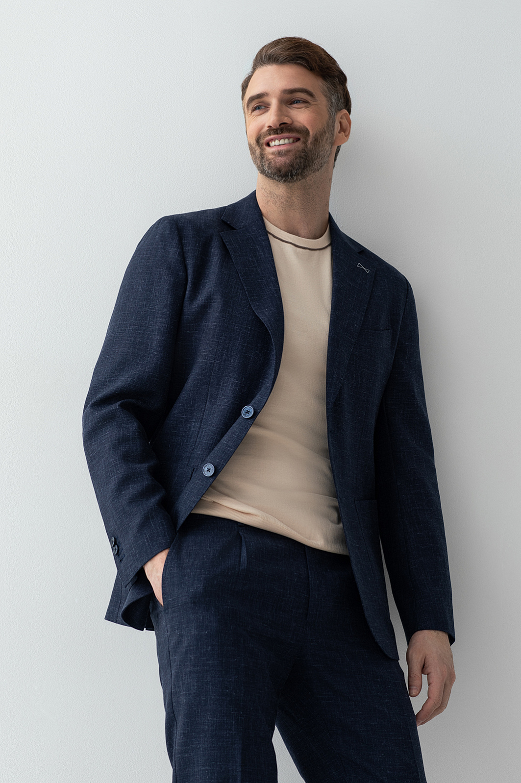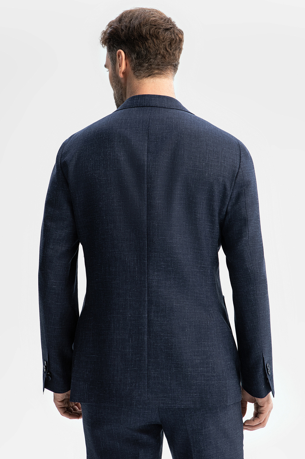 Роскошный темно-синий однобортный пиджак KANZLER из шерсти, льна и шелка с пуговицами в тон — воплощение элегантности и портновского мастерства. Облегченный крой с умеренно зауженным силуэтом и накладными карманами легко адаптируется к фигуре, подчеркивая достоинства. Полотняное переплетение темных и более светлых нитей создает красивый рисунок на ткани. Дорогой костюмный материал из тонкой шерсти, льна и шелка хорошо держит форму. Сертифицированная овечья шерсть Супер 120S (82%) сохраняет естественное тепло, лен (15%) отлично пропускает воздух и поддерживает теплообмен, шелк (3%) придает ткани благородный лоск. Параметры модели: рост 189, 102-80-99 Размер на модели: 50