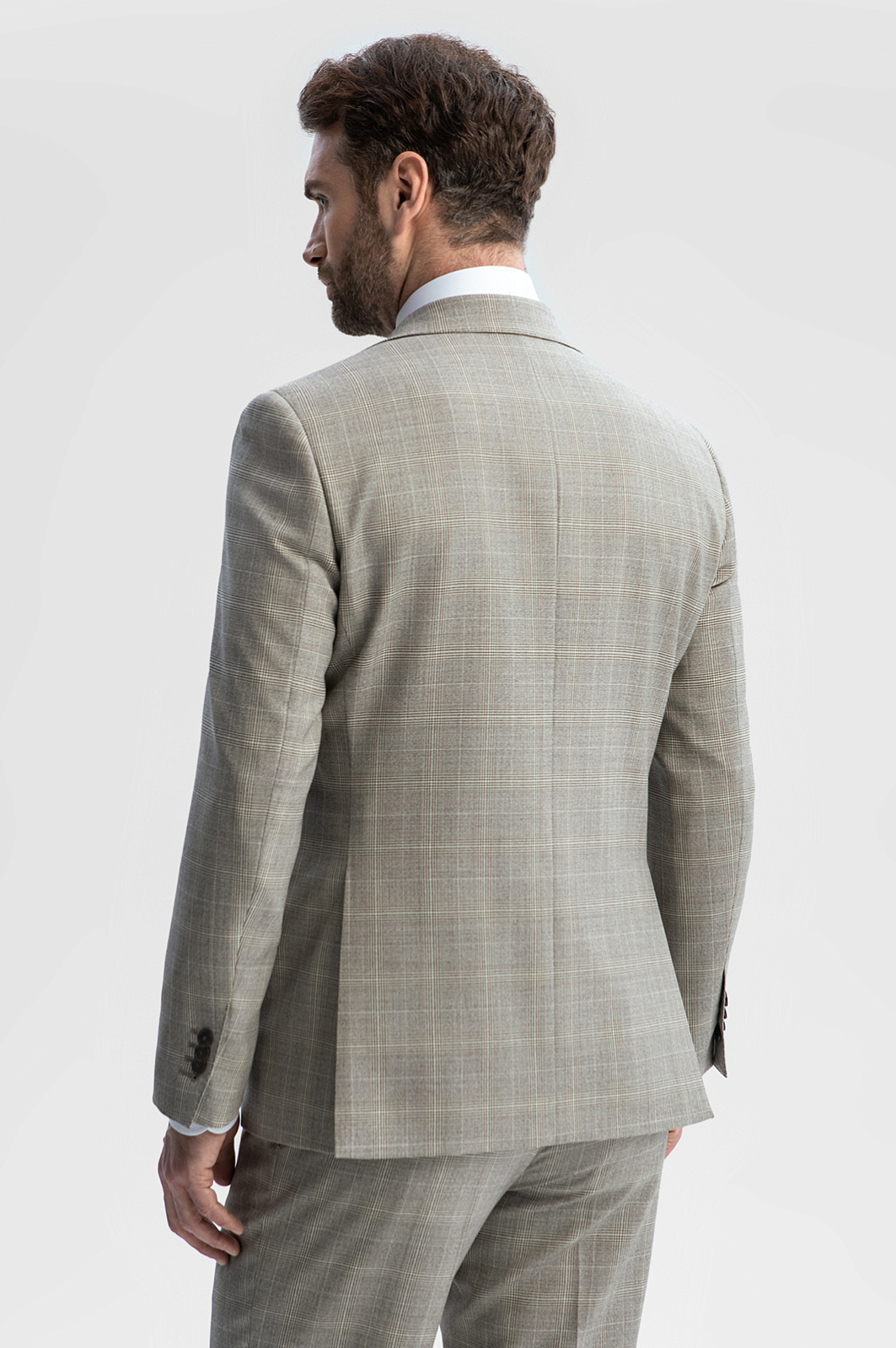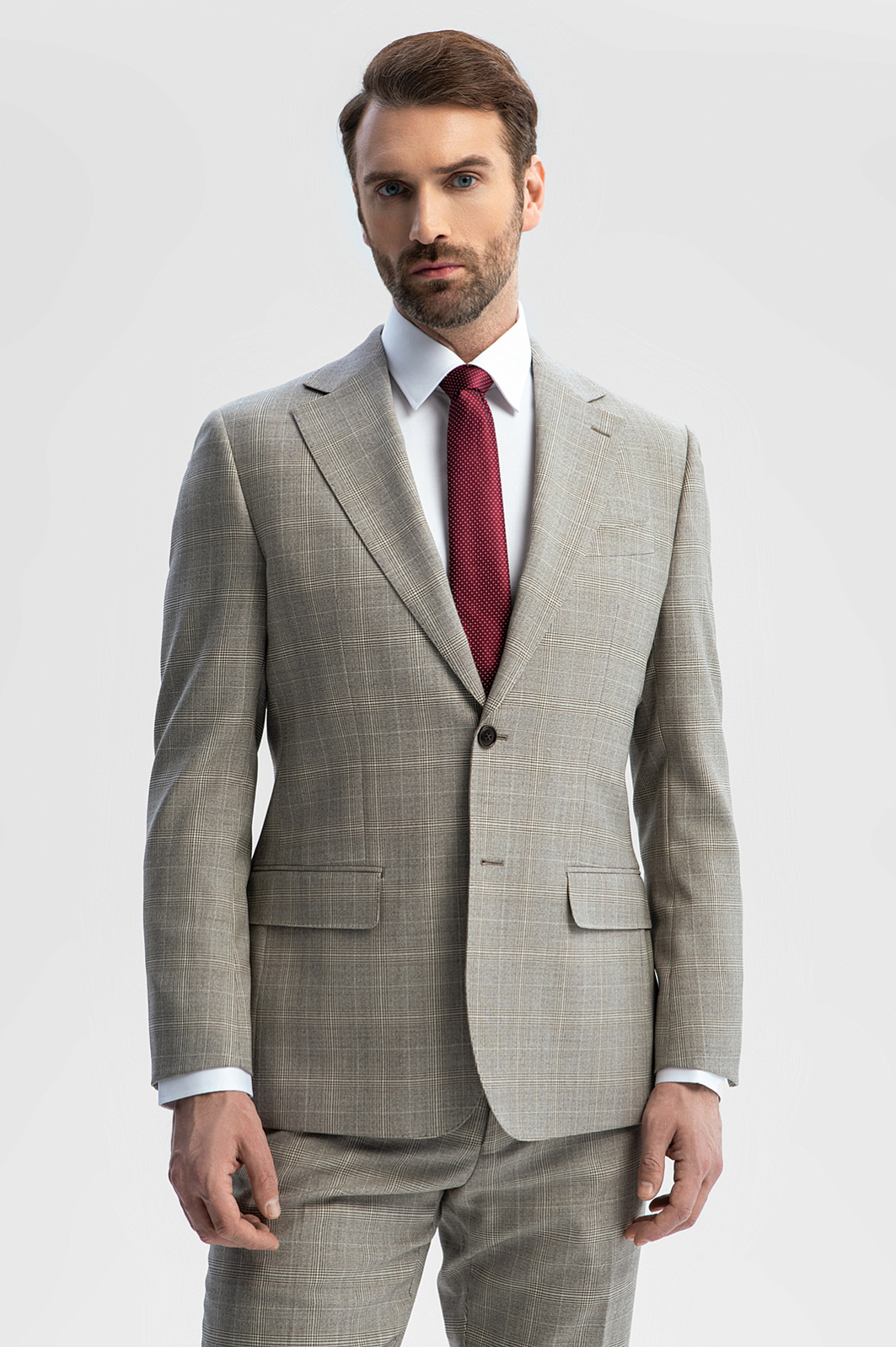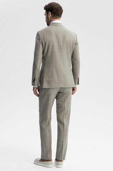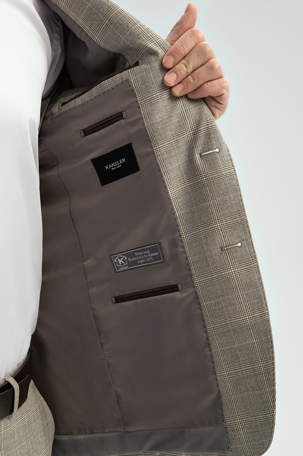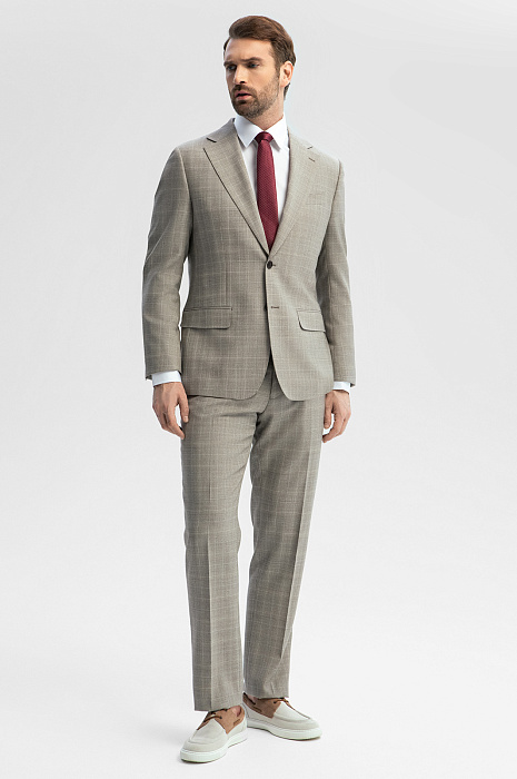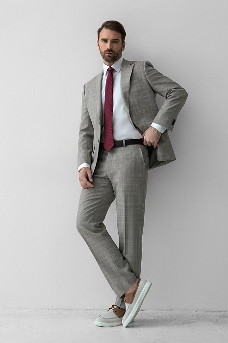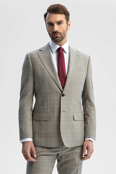 Серо-бежевый однобортный пиджак KANZLER в клетку — безусловный шедевр портновского искусства, воплощенный в классическом крое и дорогой ткани из тонкой шерсти Cупер 120S. Его безупречное качество и благородная изысканность заслуживают особого внимания. Модель универсального кроя с четко очерченной линией плеча хорошо сидит на любом типе фигуры. В соответствии с классическими канонами выполнены умеренно широкие лацканы, нагрудный карман, нижние карманы с клапаном и шлицы сзади. Удовольствие от роскошной костюмной шерсти можно ощутить кончиками пальцев, слегка прикоснувшись. Тонкие упругие волокна берегут естественное тепло тела и демонстрируют стойкость и упорство в сохранении формы.