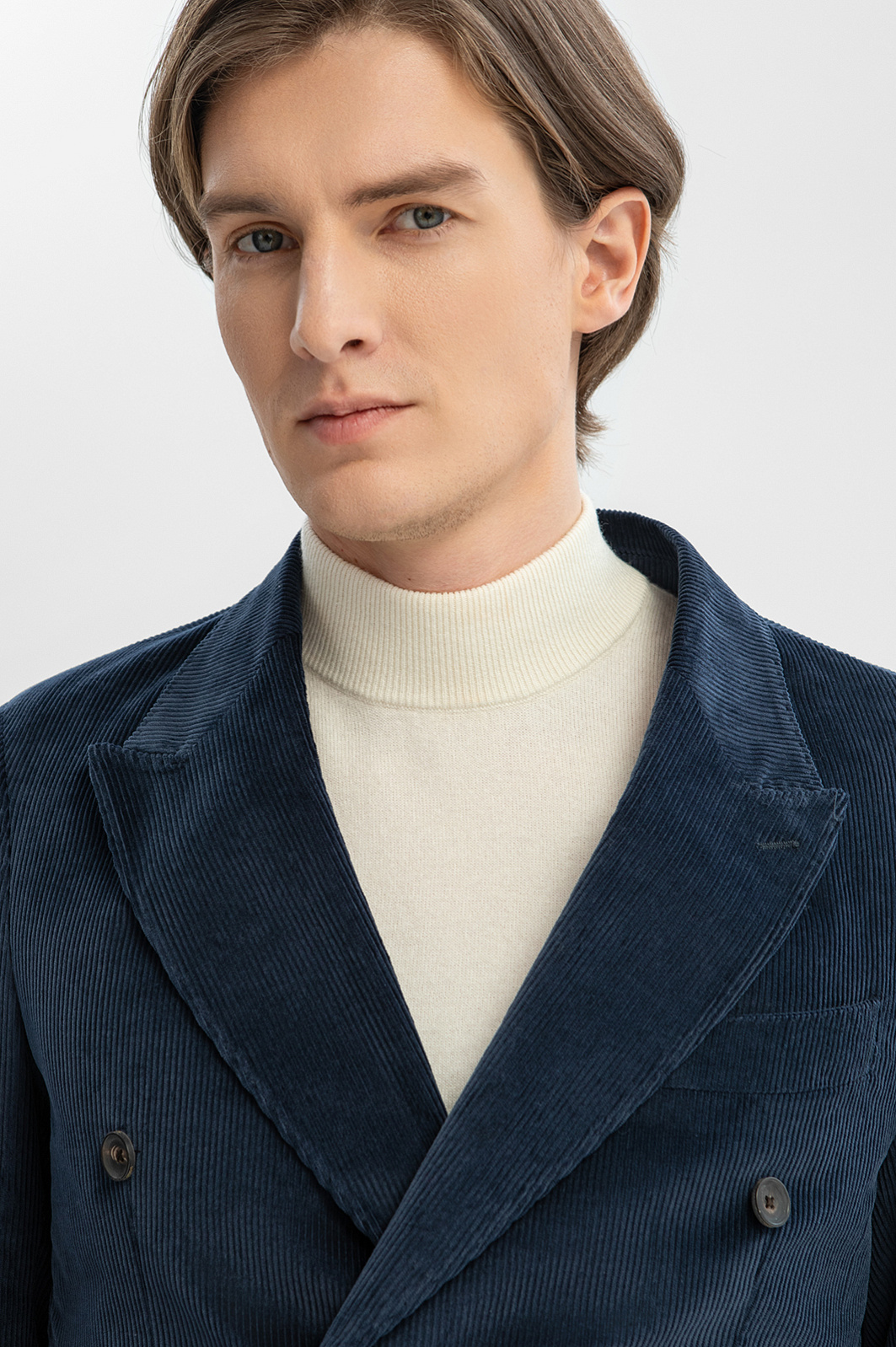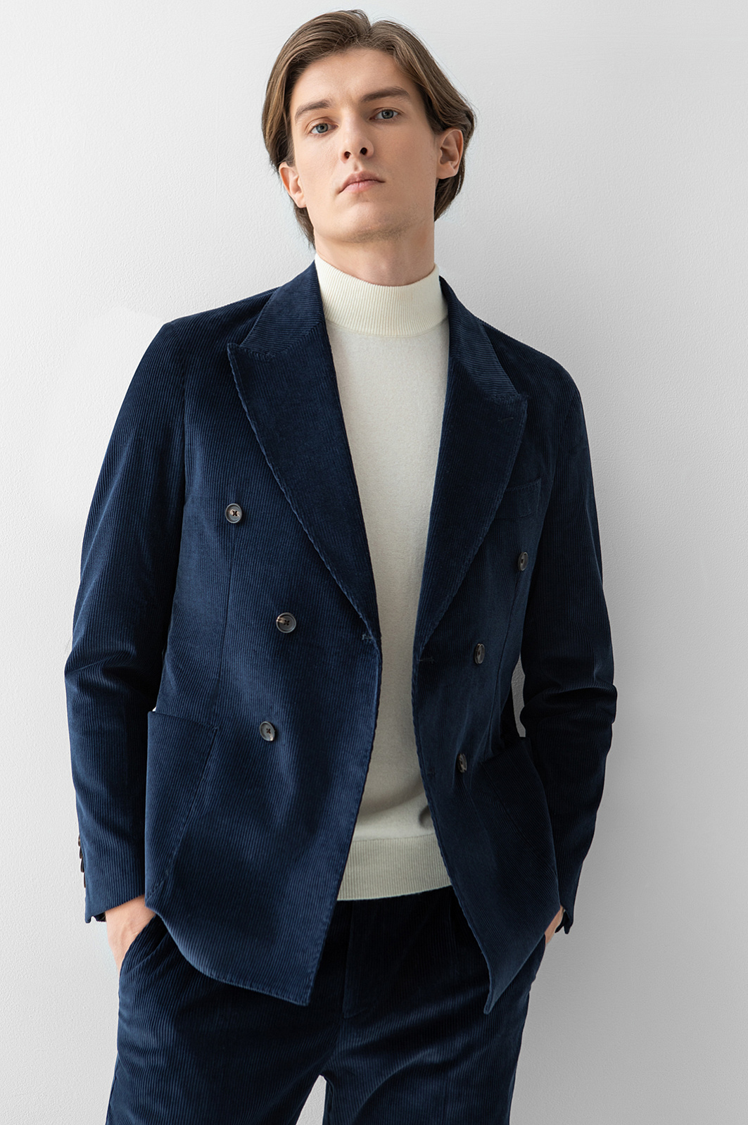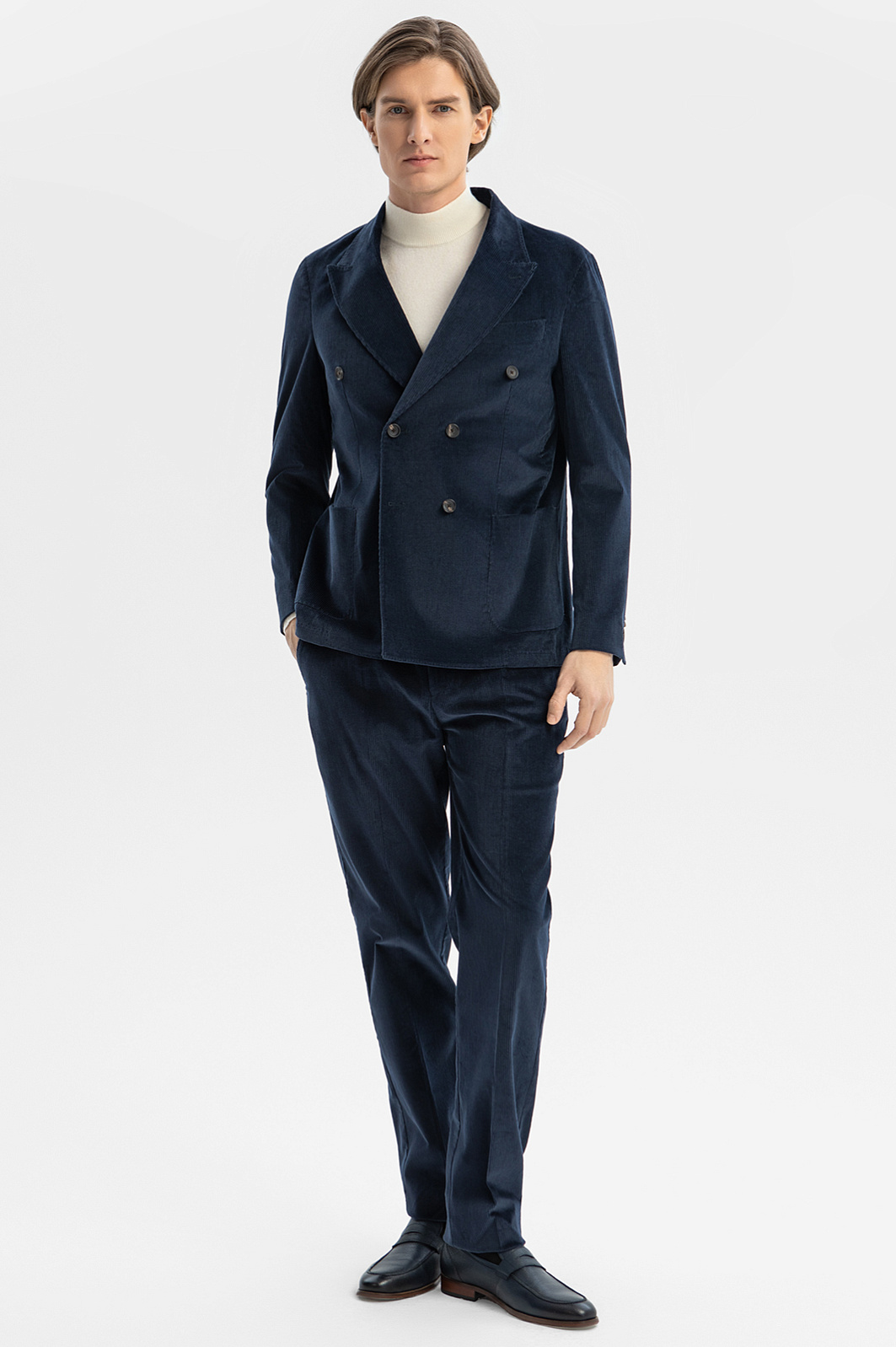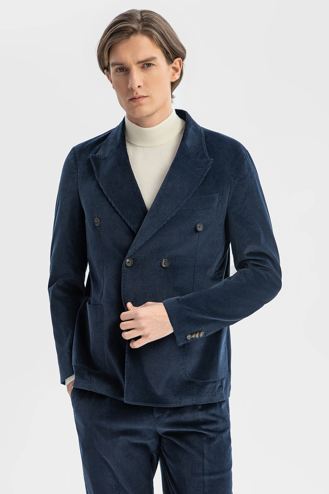 Синий двубортный пиджак KANZLER из лимитированной коллекции сшит из вельветовой ткани, произведенной признанным лидером в создании премиальных тканей из хлопка — мануфактурой Duca Visconte di Modrone (Италия). Облегченная модель без подкладки с накладными карманами и широкими лацканами — одежда хорошего настроения. Стильный пиджак подойдет для творческой работы, дружеских встреч и отдыха. Вельвет превосходного качества сделан из гипоаллергенного воздухопроницаемого хлопка (99%). Его натуральные волокна поддерживают приятную для тела температуру. Небольшая добавка эластана (1%) помогает держать форму и укрепляет ткань. Параметры модели: рост 191, 97-77-99 Размер на модели: 50