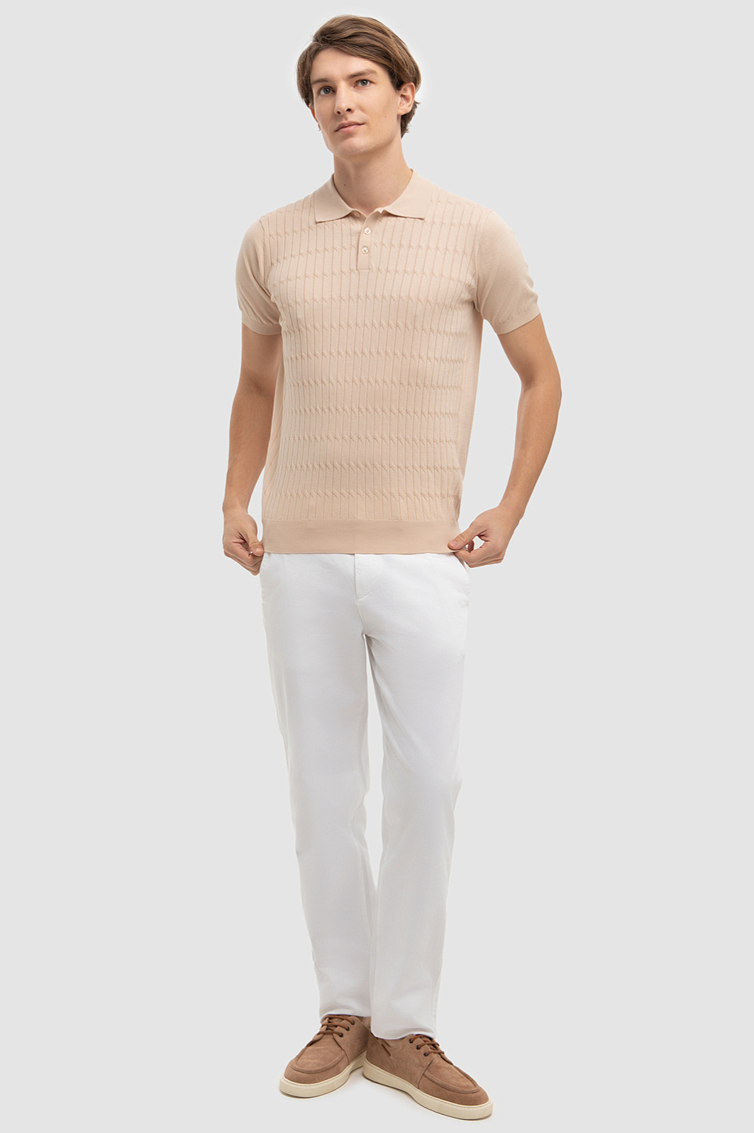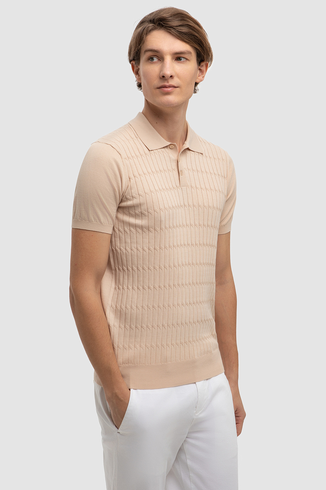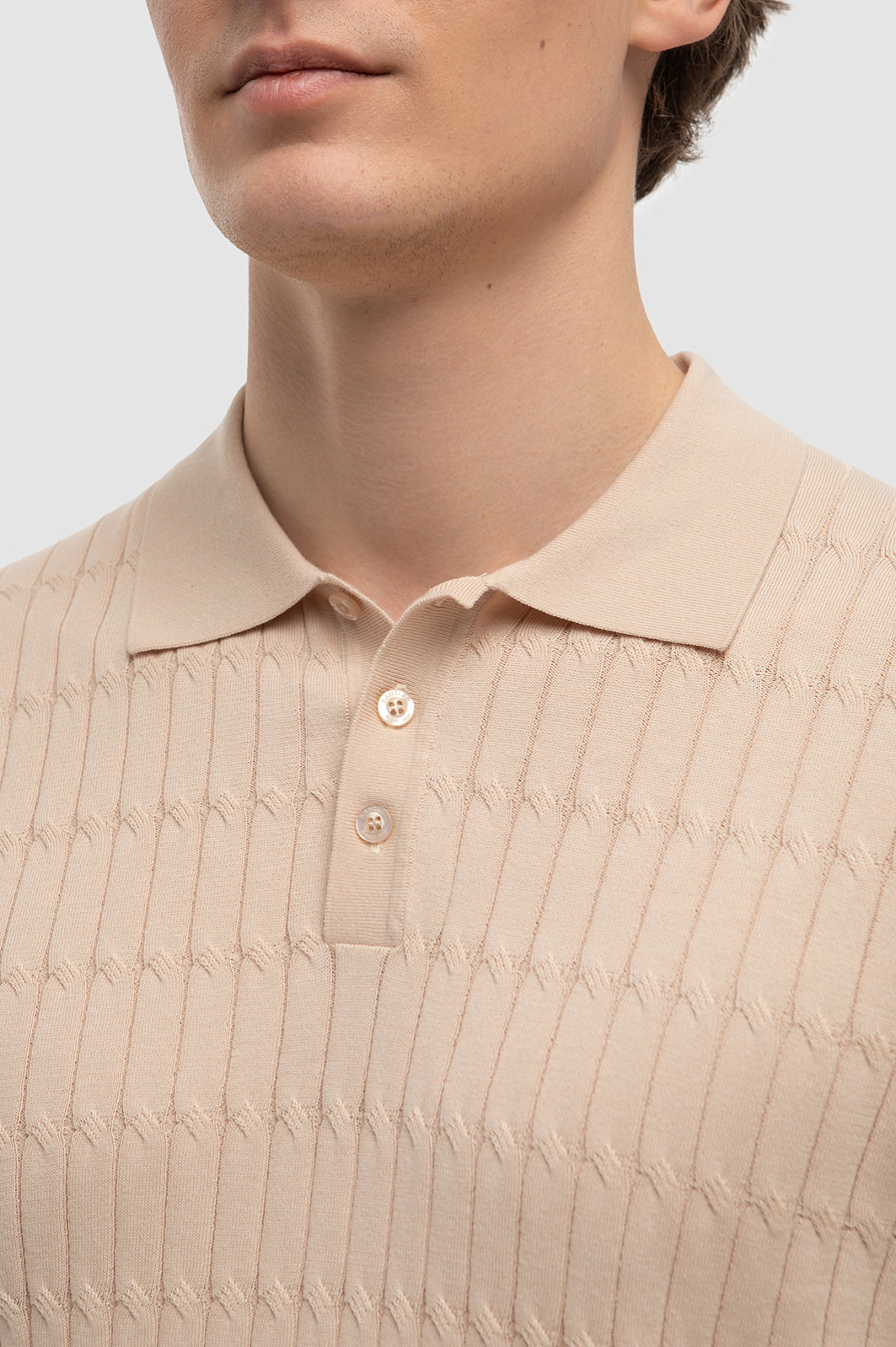 Однотонное бежевое поло KANZLER с геометричным узором и отложным воротником подружится с образом в любой цветовой гамме. Главное преимущество изделия - натуральный дышащий материал. Премиальный, длинноволокнистый хлопок Пима обладает особой прочностью и шелковистой мягкостью - изделие выглядит роскошно и дарит невероятный комфорт в носке. Мягкий материал подходит для людей с чувствительной кожей и поддерживает оптимальную для тела температуру даже в жару. Пастельный цвет и лаконичный крой относит эту модель к стилю "тихая роскошь", для которой характерна сдержанная элегантность и стиль вне времени. Наши стилисты рекомендуют носить эту модель с брюками прямого кроя. Параметры модели: рост 191, 97-77-99 Размер на модели: M