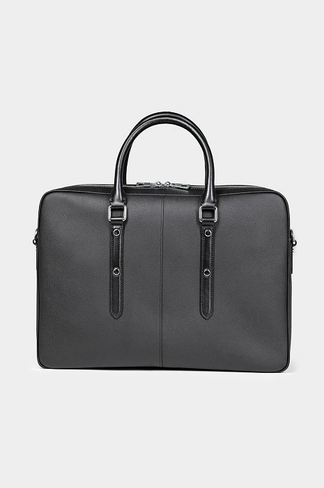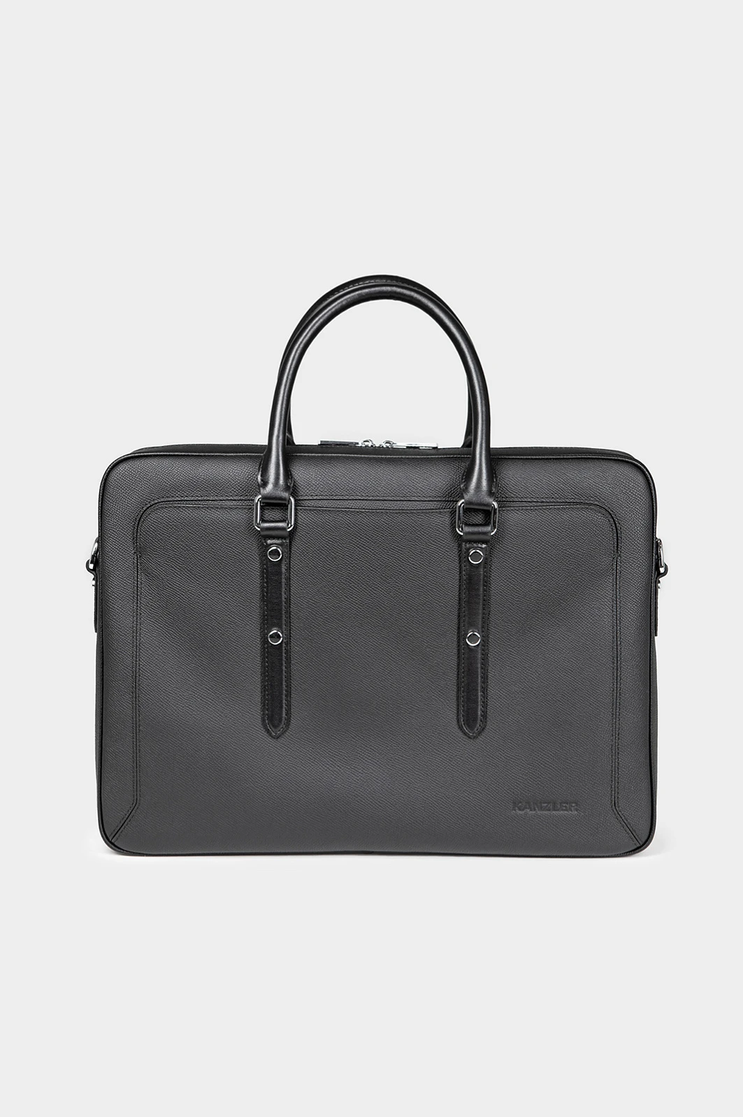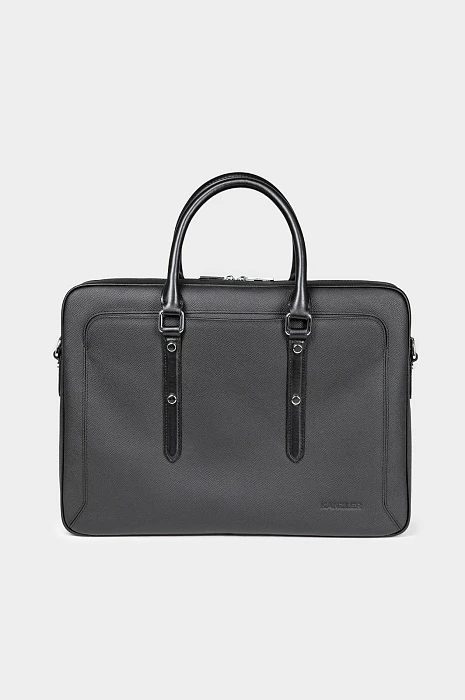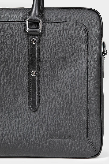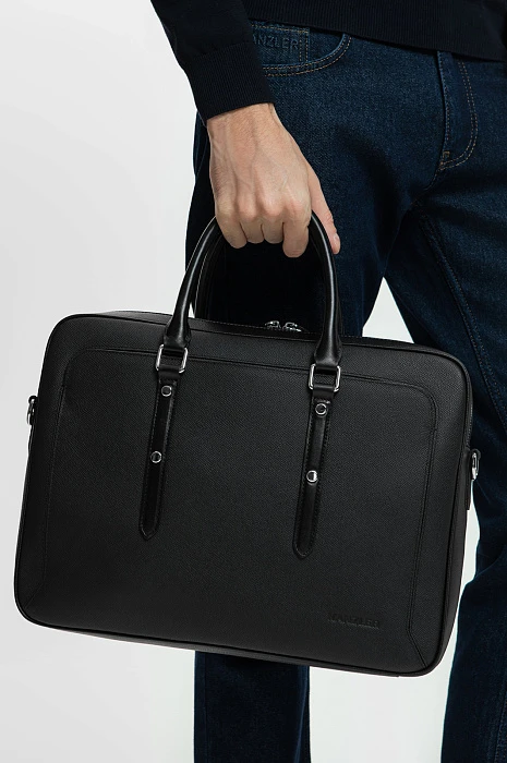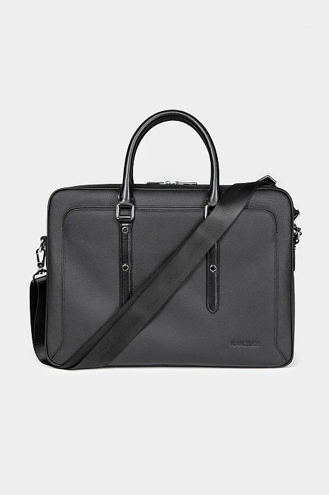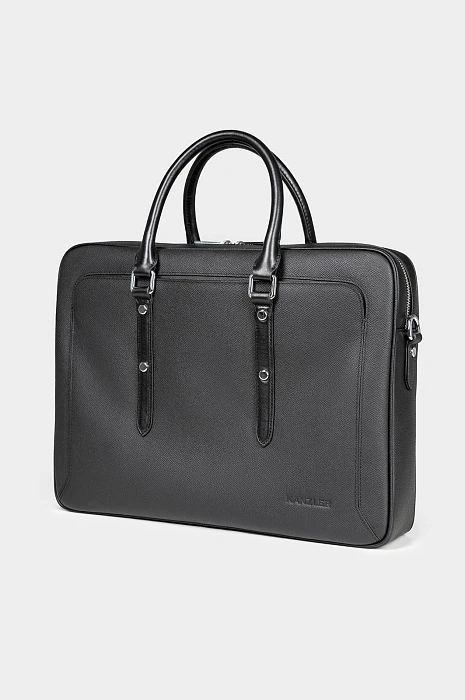 Чёрный портфель KANZLER из натуральной кожи — элегантный и функциональный аксессуар делового человека. Элегантная модель легко вмещает ноутбук, документы формата A4 и необходимые мелочи. Компактный размер делает портфель необременительным аксессуаром, который можно носить в офис ежедневно. Фактурная кожа придаёт модели выразительность и сдержанный шик, а ручки и ремешки из гладкой кожи — уникальность. Двухзамковая молния позволяет быстро достать или убрать вещи, сохранив аккуратную форму портфеля.