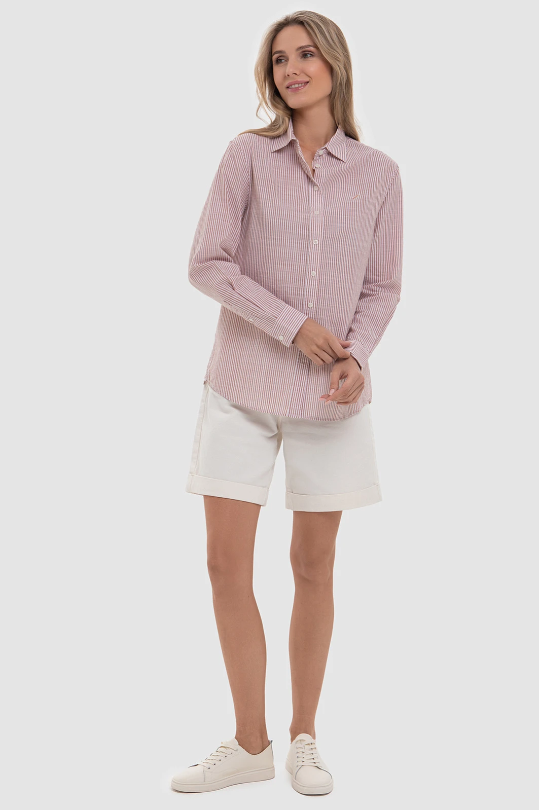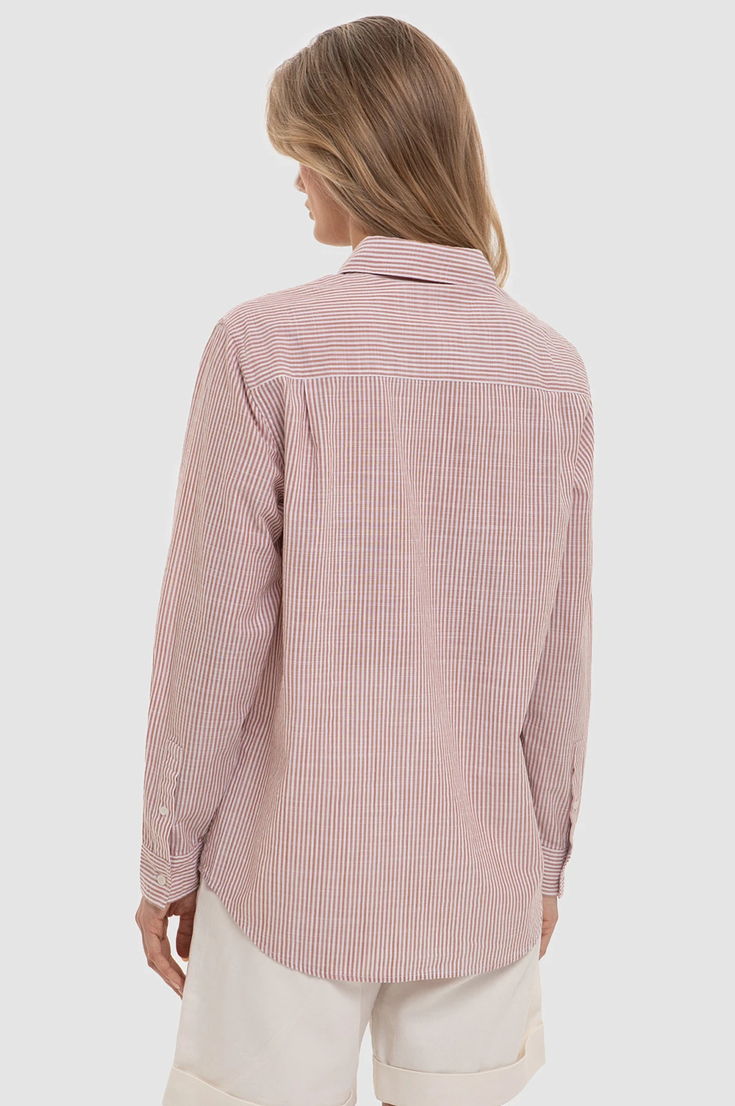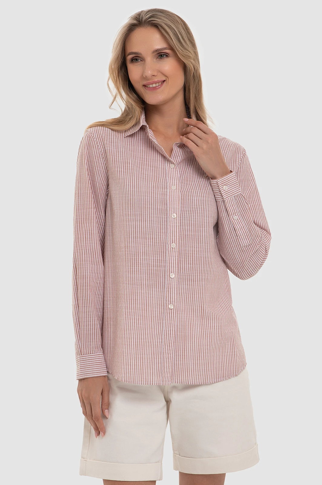 Рубашка KANZLER полуприлегающего силуэта в тонкую вертикальную светло-коричневую с белым полоску из мягкого 100-процентного хлопка подчеркнет Ваш безупречный вкус. Полукруглая форма нижнего края позволяет носить модель навыпуск. Дорогая натуральная ткань — невесомый органический хлопок, обладающий гипоаллергенностью и воздухопроницаемостью. Она защищает кожу от ультрафиолета, отлично поглощает влагу и поддерживает оптимальную температуру тела. Рубашка создаст непринужденный и элегантный образ для расслабленного отдыха и путешествий. Параметры модели: рост 180, 87-61-91 Размер на модели: S
