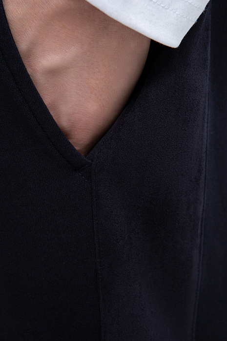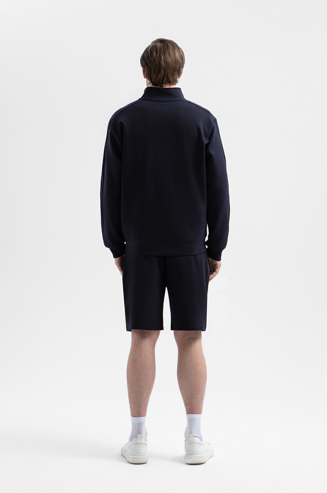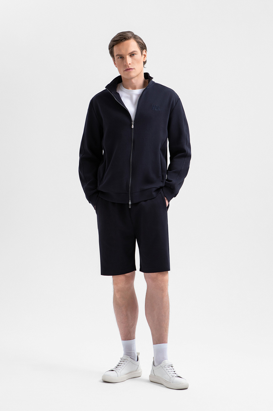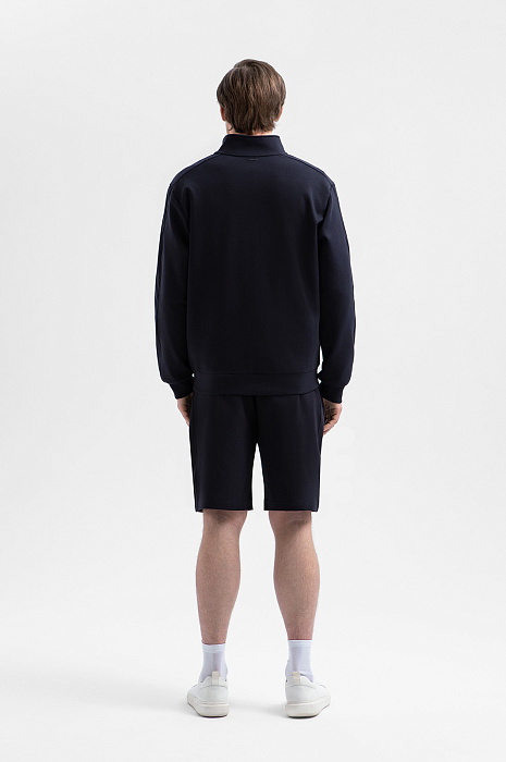 Тёмно-синий костюм KANZLER из хлопкового трикотажа с вставками из полиэстера — универсальный комплект для активного отдыха, прогулок и спокойных уикендов на природе. Костюм состоит из толстовки на молнии, украшенной вышитым логотипом и фирменным шильдиком, и свободных удлинённых шорт на кулиске. Комплект сшит из мягкого смесового хлопка. Его натуральные гипоаллергенные волокна поддерживают ощущение свежести и сохраняют естественное тепло тела. Добавление полиэстера и эластана придаёт материалу прочность и пластичность.