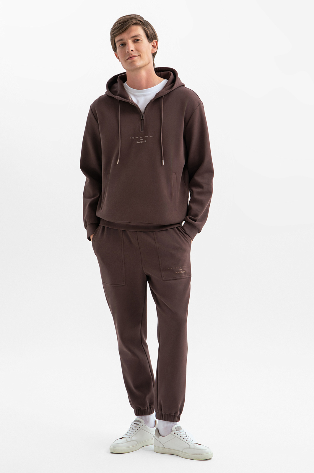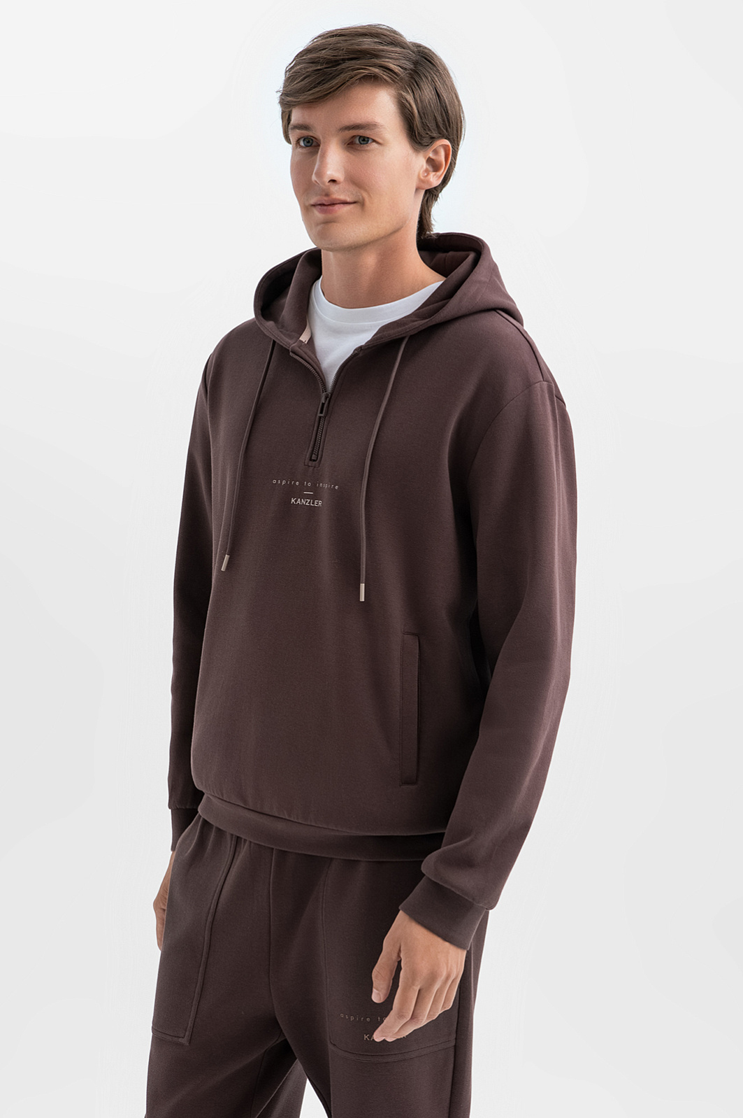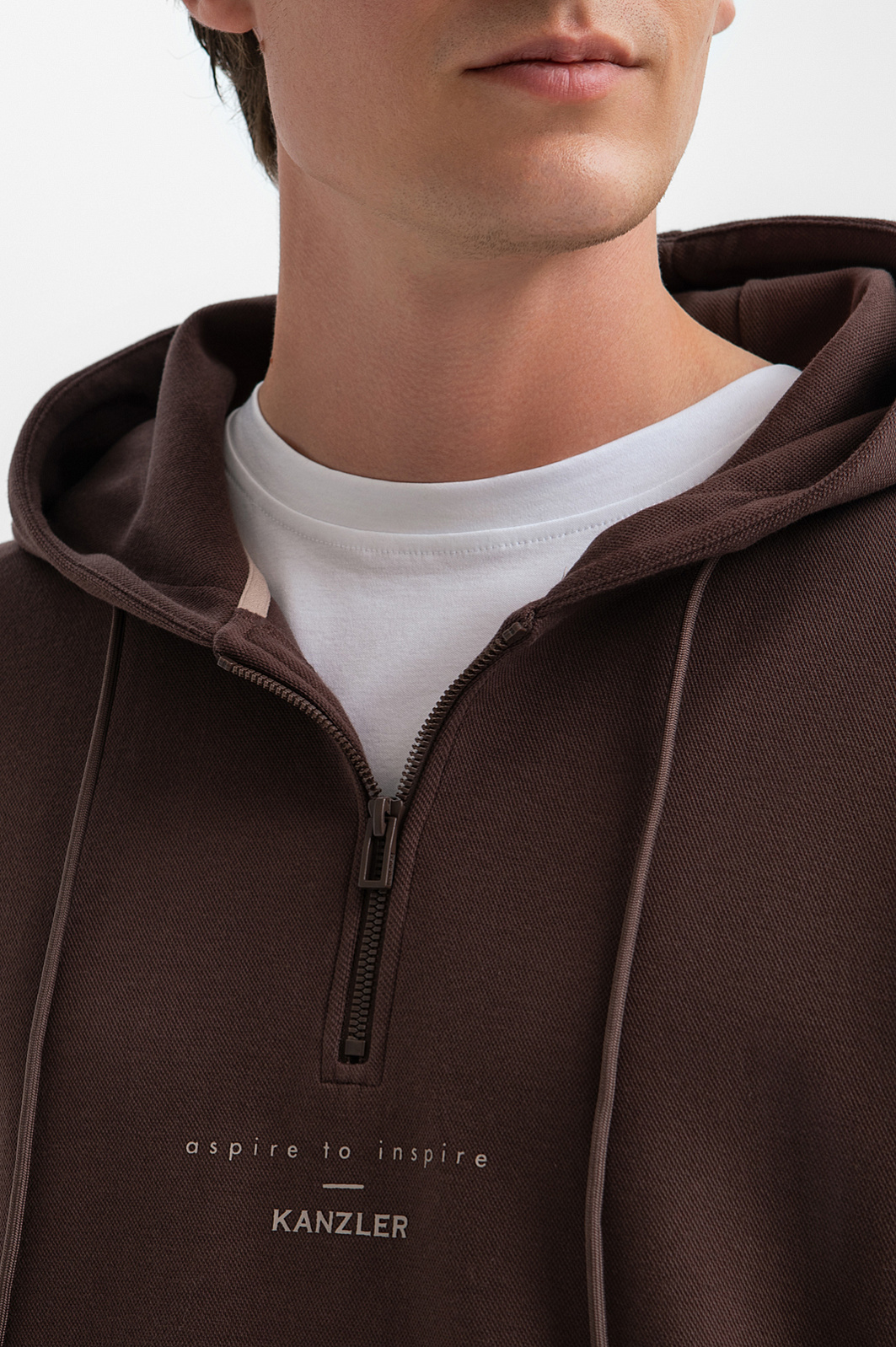 Коричневая толстовка KANZLER с капюшоном, украшенная на груди слоганом, адресована свободным по духу и образу жизни людям, которые ценят комфорт. Модель выполнена из гладкого смесового хлопкового трикотажа. Натуральный хлопок обеспечивает воздухообмен и поддержание приятной для тела температуры. Волокна полиэстера и эластана служат прочности, износоустойчивости и поддержанию формы. Толстовка — идеальный выбор для отдыха и спортивных занятий. Для создания костюма ее можно дополнить коричневыми спортивными брюками KANZLER. Параметры модели: рост 191, 97-77-99 Размер на модели: M