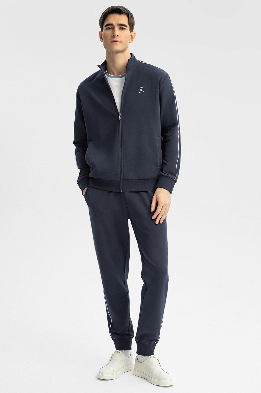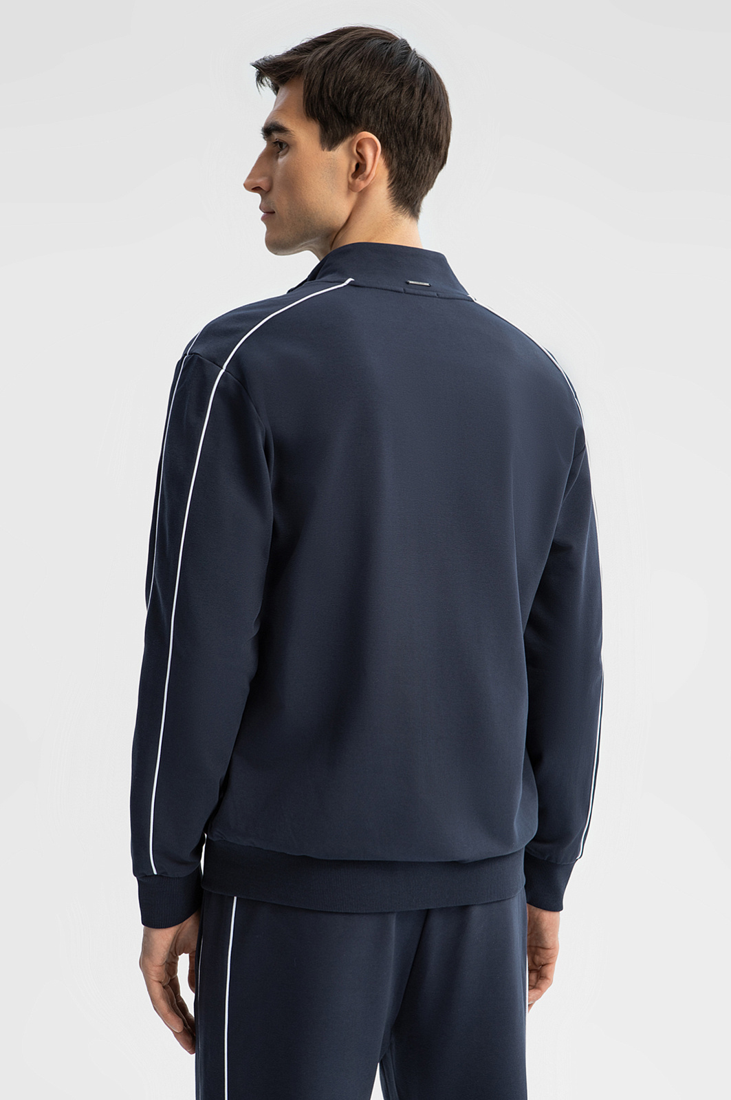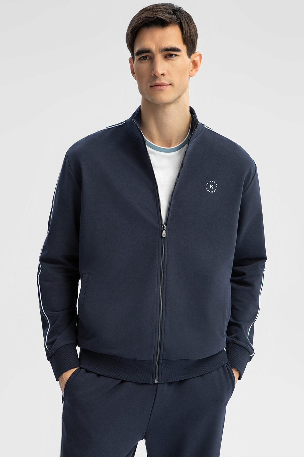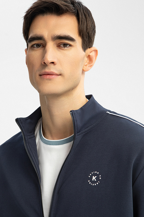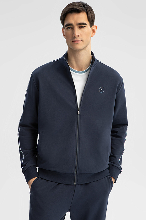 Универсальная толстовка KANZLER на молнии глубокого синего цвета может быть частью спортивного аутфита с джоггерами или дополнением к городскому повседневному образу с джинсами. Расслабленный крой и тянущийся материал из хлопка обеспечивают легкое и свободное движение на прогулке или тренировке. Спортивный характер модели подчеркивают тонкие вертикальные полоски на рукавах и небольшой принт на груди. Прочный качественный смесовой материал — залог долговечности изделия. В составе: воздухопроницаемый гипоаллергенный хлопок (66%), износоустойчивый полиэстер и эластичный спандекс. Параметры модели: рост 192, 101-76-97 Размер на модели: M