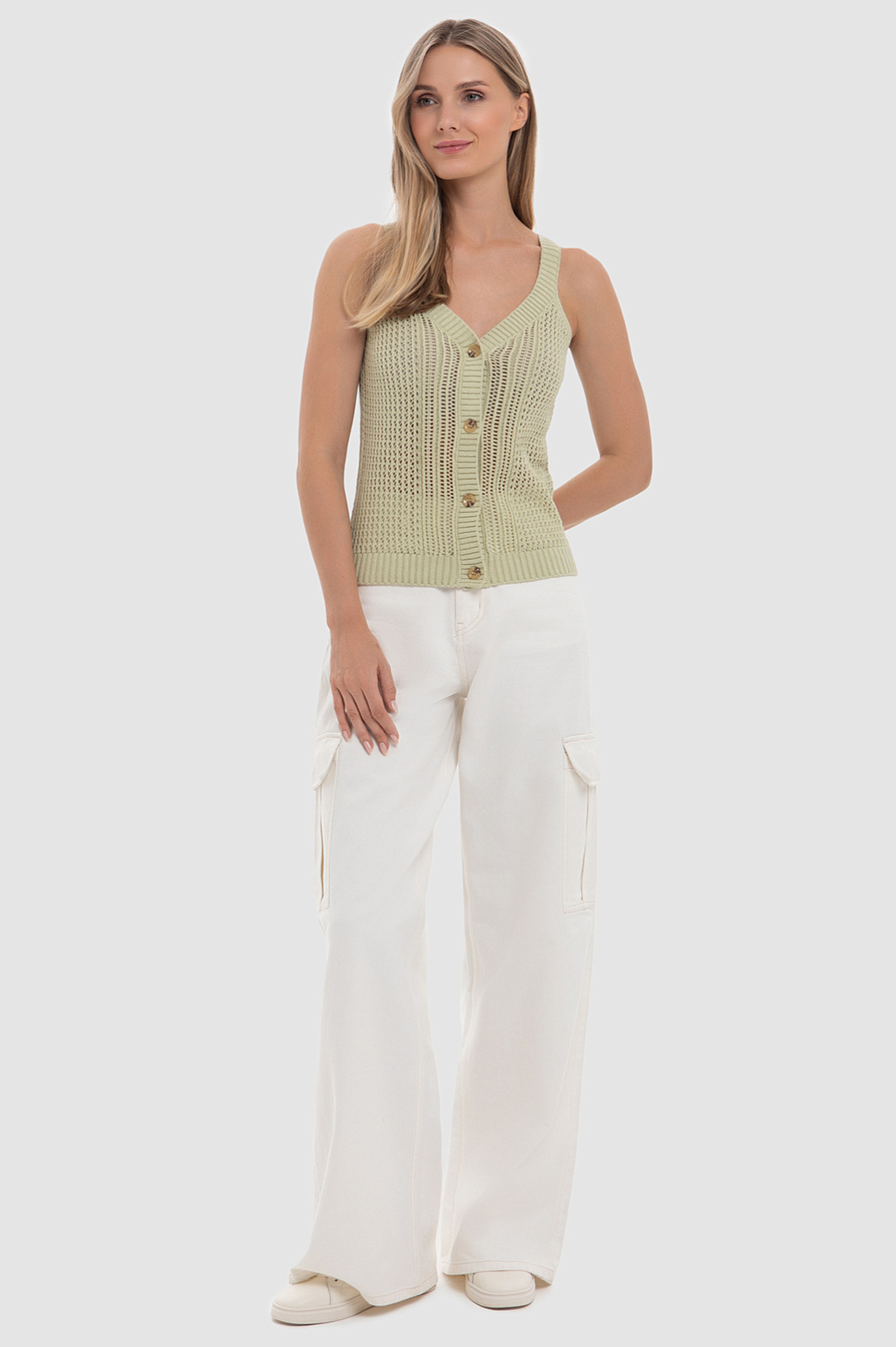Нежно-оливковый топ ажурной вязки привнесет в образ легкости и шарма. Мягкость и дышащие свойства хлопка объединены с прочностью акрила, благодаря чему топ не только исключительно комфортен, но и надолго сохранит первоначальную форму. Ажурная вязка создает ощущение воздушности и интриги. Коричневые пуговицы продолжают природную стилистику и подчеркивают естественность оливкового оттенка. Модель может стать как основой повседневного образа, так и выбором для особого случая. Параметры модели: рост 180, 87-61-91 Размер на модели: S