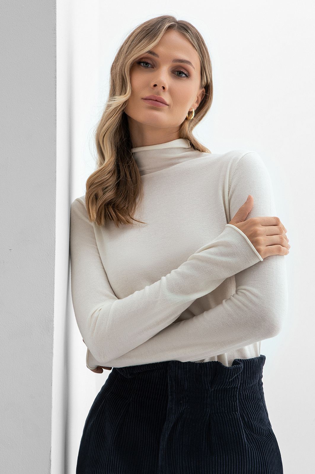 Оттенок водолазки KANZLER из шерсти и кашемира напоминает туман, который ранним утром сгустился над лесным озером. Модель создана для спокойных и расслабленных дней, когда хочется не спеша спуститься из номера на завтрак, а потом отправиться на прогулку, любуясь еще не проснувшимся городом и красотами природы. Высокий воротник красиво драпируется на шее. Удлиненные рукава можно носить свободно или присобрать на запястьях. В составе смесового премиального материала — шерсть и кашемир. Это воздухопроницаемая ткань, которая регулирует теплообмен, сохраняя оптимальную для тела температуру. Добавление ценного пуха кашмирских коз придает ей нежность и мягкость.