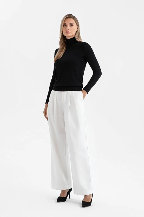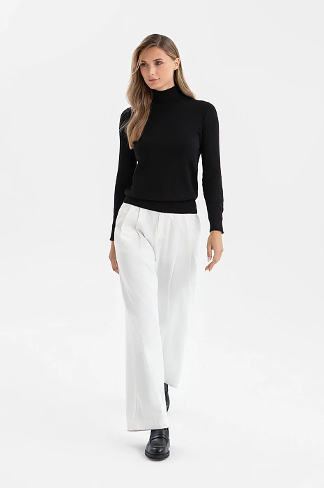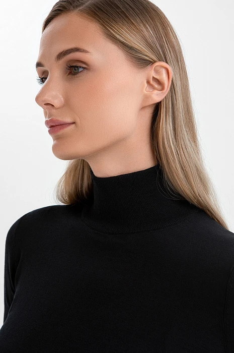 Роскошная чёрная водолазка KANZLER из хлопка и шёлка подчёркивает внутреннюю силу и магнетизм женщины. Это изысканная и вместе с тем универсальная модель, которая подойдёт для повседневных и особых выходов. Традиционный прилегающий воротник визуально вытягивает силуэт, придавая образу утончённость, а мягкие широкие трикотажные резинки на рукавах и по низу добавляют аккуратности и создают ощущение собранности. Натуральный трикотаж из хлопка и шёлка влюбляет в себя с первого прикосновения. Такое полотно отличается воздухопроницаемостью, нежностью и благородным внешним видом, который сохраняется даже при частой носке.