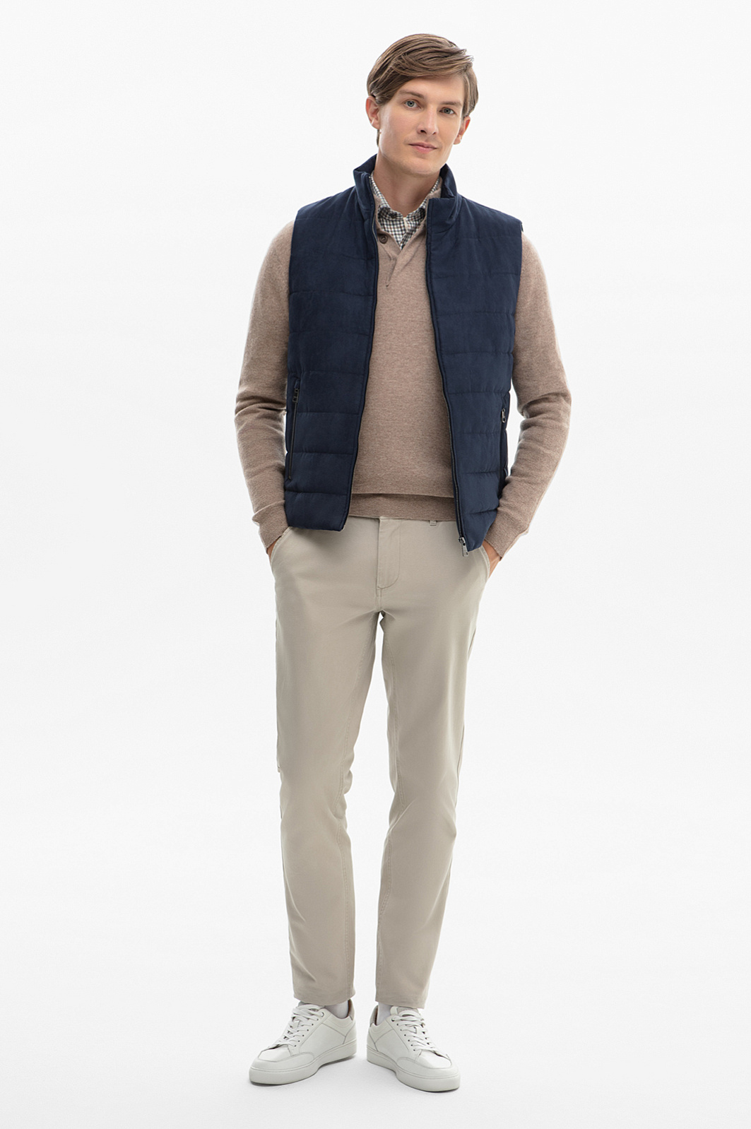 Стеганый жилет в оттенке navy — основа для многослойных демисезонных образов. Модель получилась лаконичной и универсальной. Для пошива изделия с двумя карманами дизайнеры использовали прочный, приятный на ощупь материал с бархатистой поверхностью. Изделие хорошо удерживает тепло, защищает от холодного ветра и обеспечивает полный комфорт в процессе носки. Горизонтальная стежка не только добавляет изысканный визуальный акцент, но и обеспечивает равномерное распределение тепла, а высокий воротник защищает шею от ветра. Молния на всю длину придаёт жилету динамичный вид, а брендированные эглеты завершают продуманный образ. Насыщенный темно-синий оттенок жилета идеально сочетается как с повседневными ансамблями с джемпером и брюками чинос, так и с более спортивными или классическими образами с брюками и рубашкой.